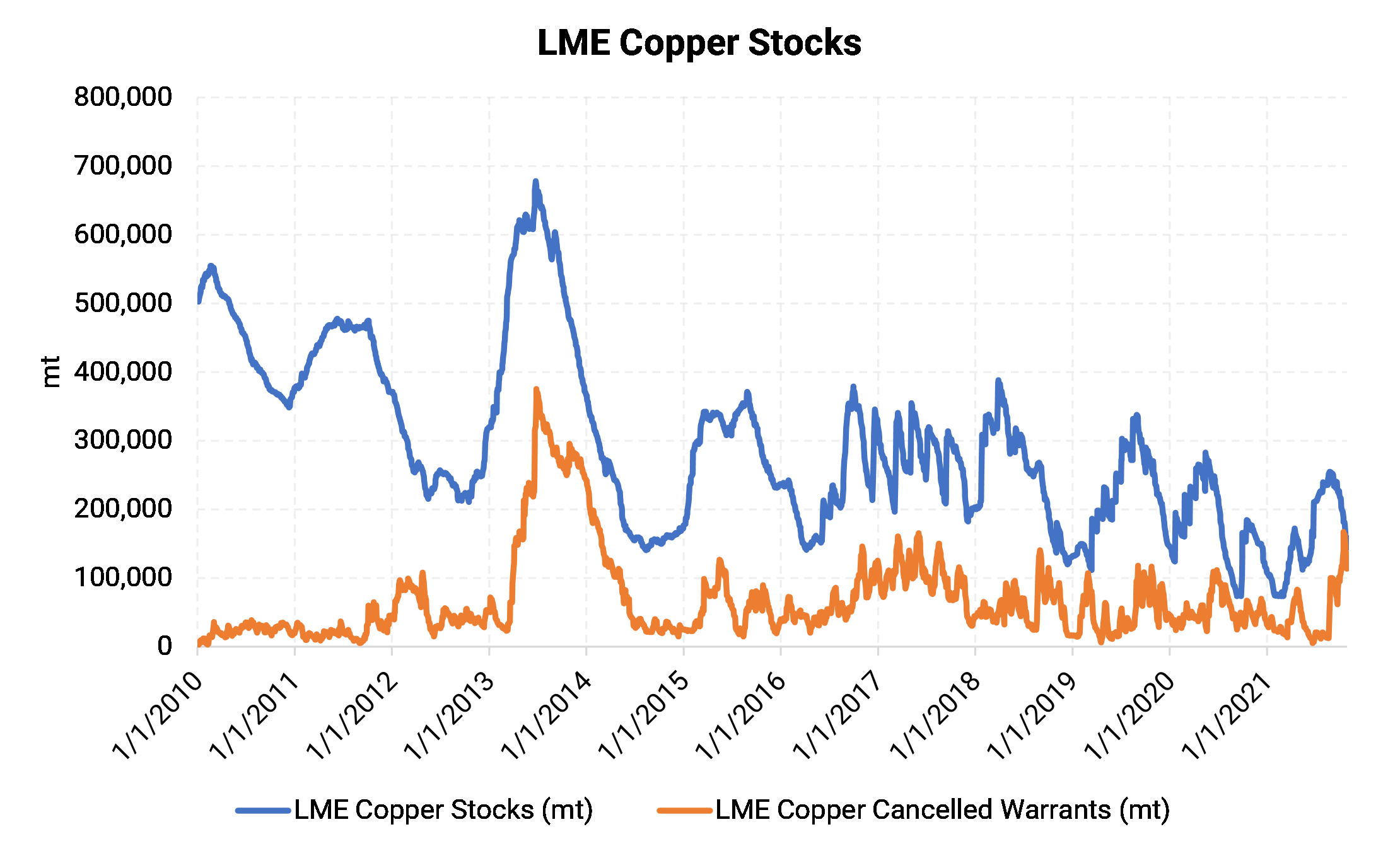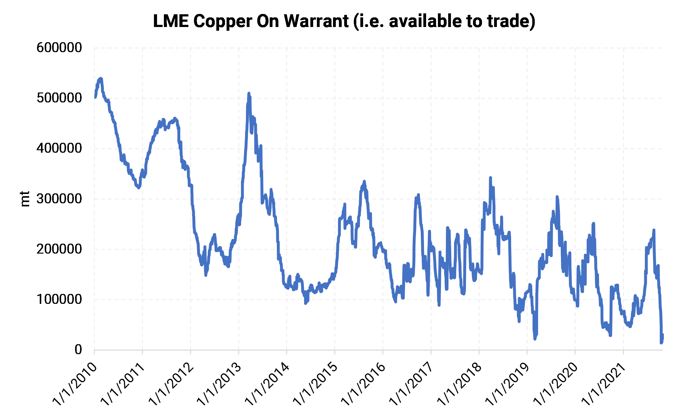 - On Friday, October 15, 2021, the LME warehouse system only had 14,150 mt of available copper for delivery, the lowest volume since 1974. On-warrant (i.e., available for delivery) stocks had been 114,200 mt on October 1. The minimum amount the LME needs to have on hand for members to make their delivery requirements is generally thought to be 6,000 mt.