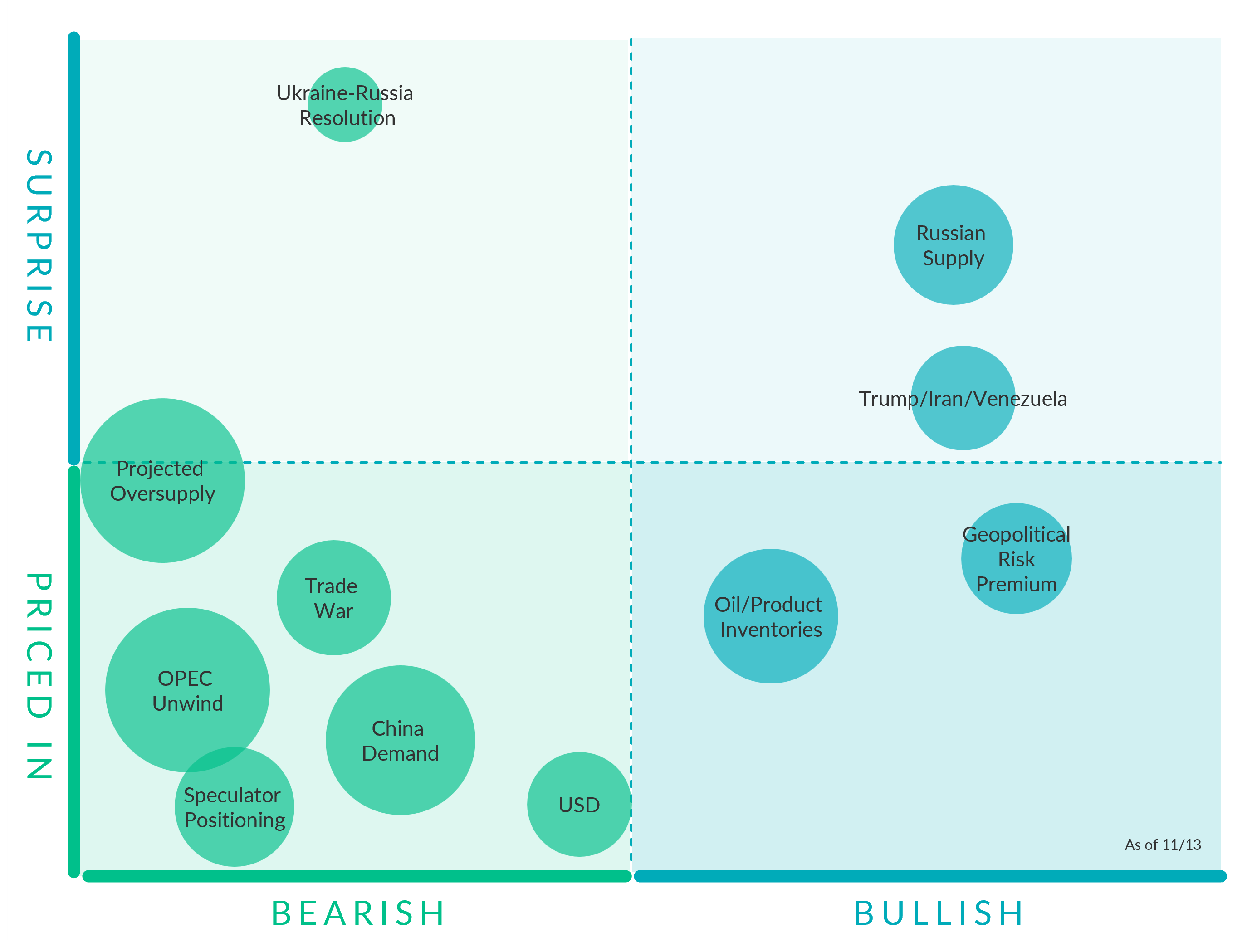 Ukraine-Russia Resolution. (Bearish, Surprise) During President Trump’s Thursday meeting with Chinese leader Xi Jinping, Trump noted, “We didn’t really discuss oil.” The absence of strong pressure on Beijing to curb Russian crude purchases remains a key revenue stream for Russia’s war effort.