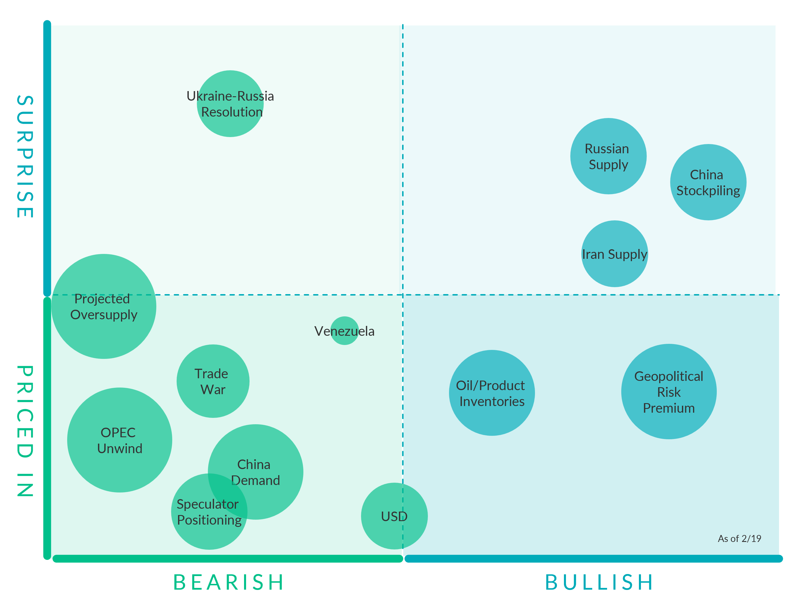 Ukraine-Russia Resolution. (Bearish, Surprise) Talks between Russia and the Ukraine are ongoing and being mediated by the US, but no tangible results are yet to arise that would bring an end to the war in Ukraine. A peace deal, if followed by the elimination of sanctions on Russian oil over its invasion of Ukraine, could unleash supply from the world's third largest producer.
