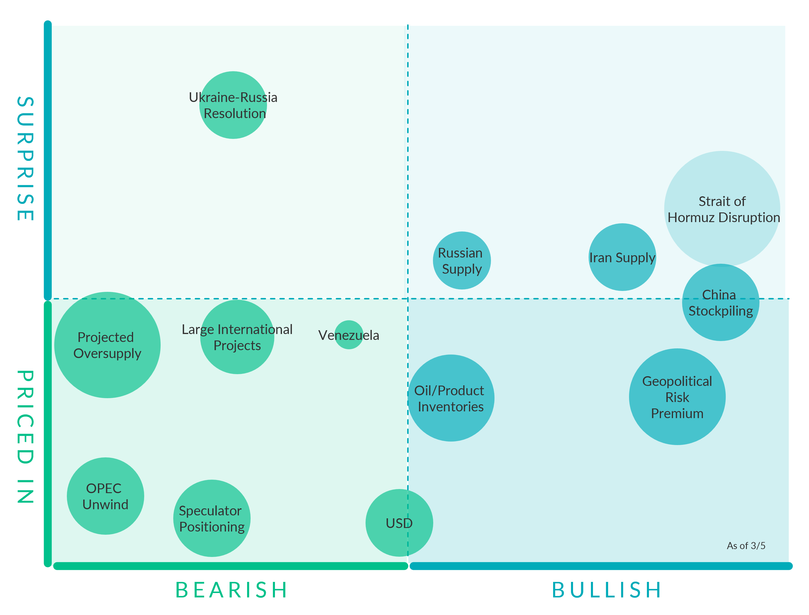 Ukraine-Russia Resolution. (Bearish, Surprise) Talks between Russia and the Ukraine are ongoing and being mediated by the US, but no tangible results are yet to arise that would bring an end to the war in Ukraine. A peace deal, if followed by the elimination of sanctions on Russian oil over its invasion of Ukraine, could unleash supply from the world's third largest producer.