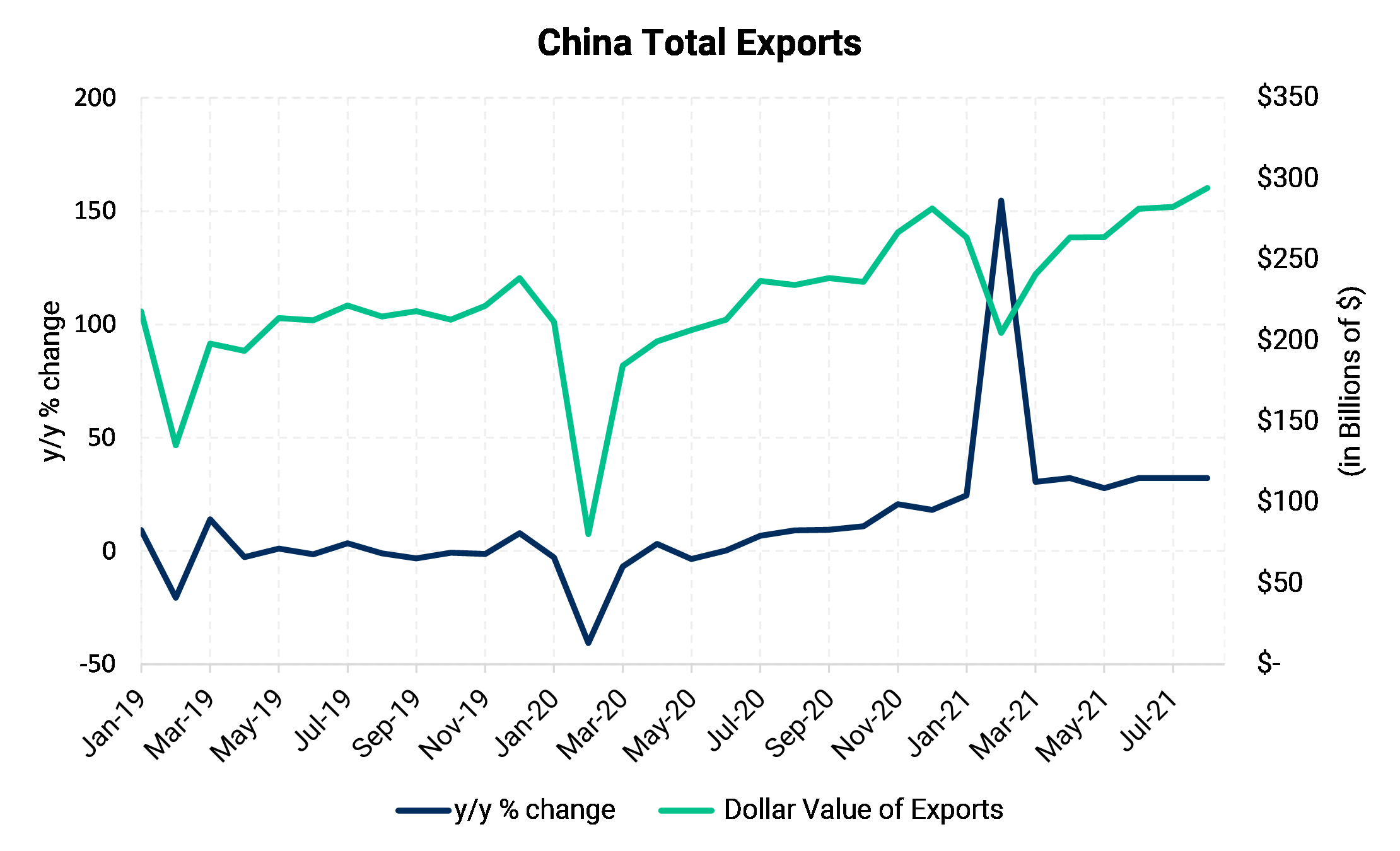 Exports have rebounded off pandemic-lows, reaching an all-time high value in August. Most recent economic data suggests that China's economy been slowing. However, hurdles such as electricity crunches and concerns over the Delta variant of COVID remain challenges for their metals production.