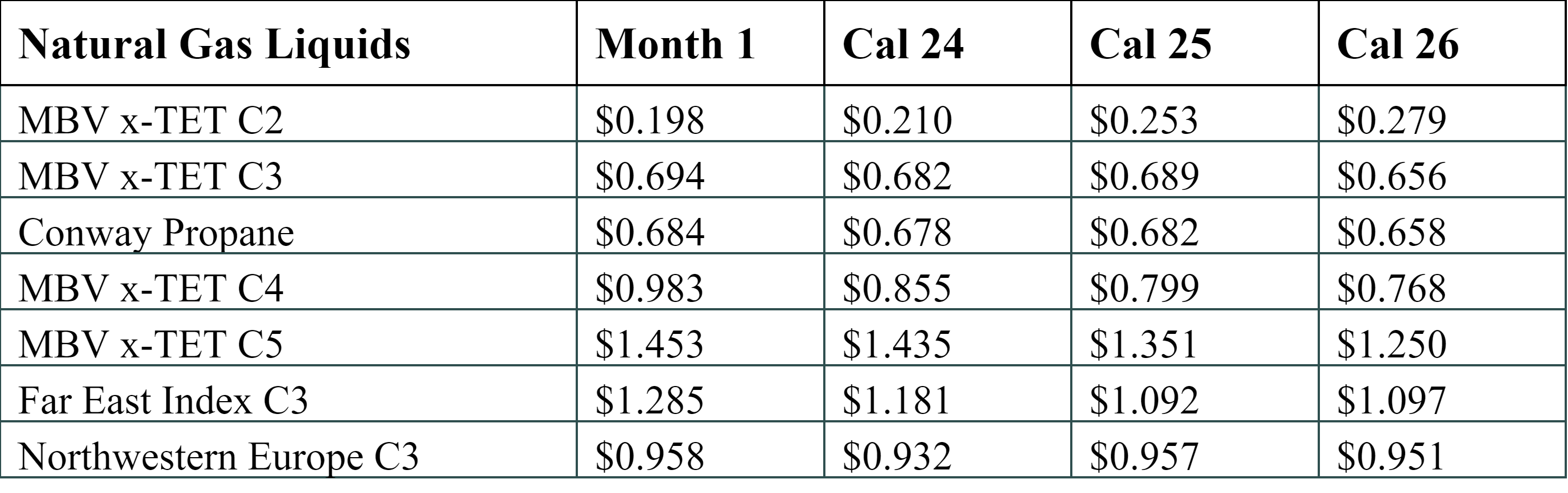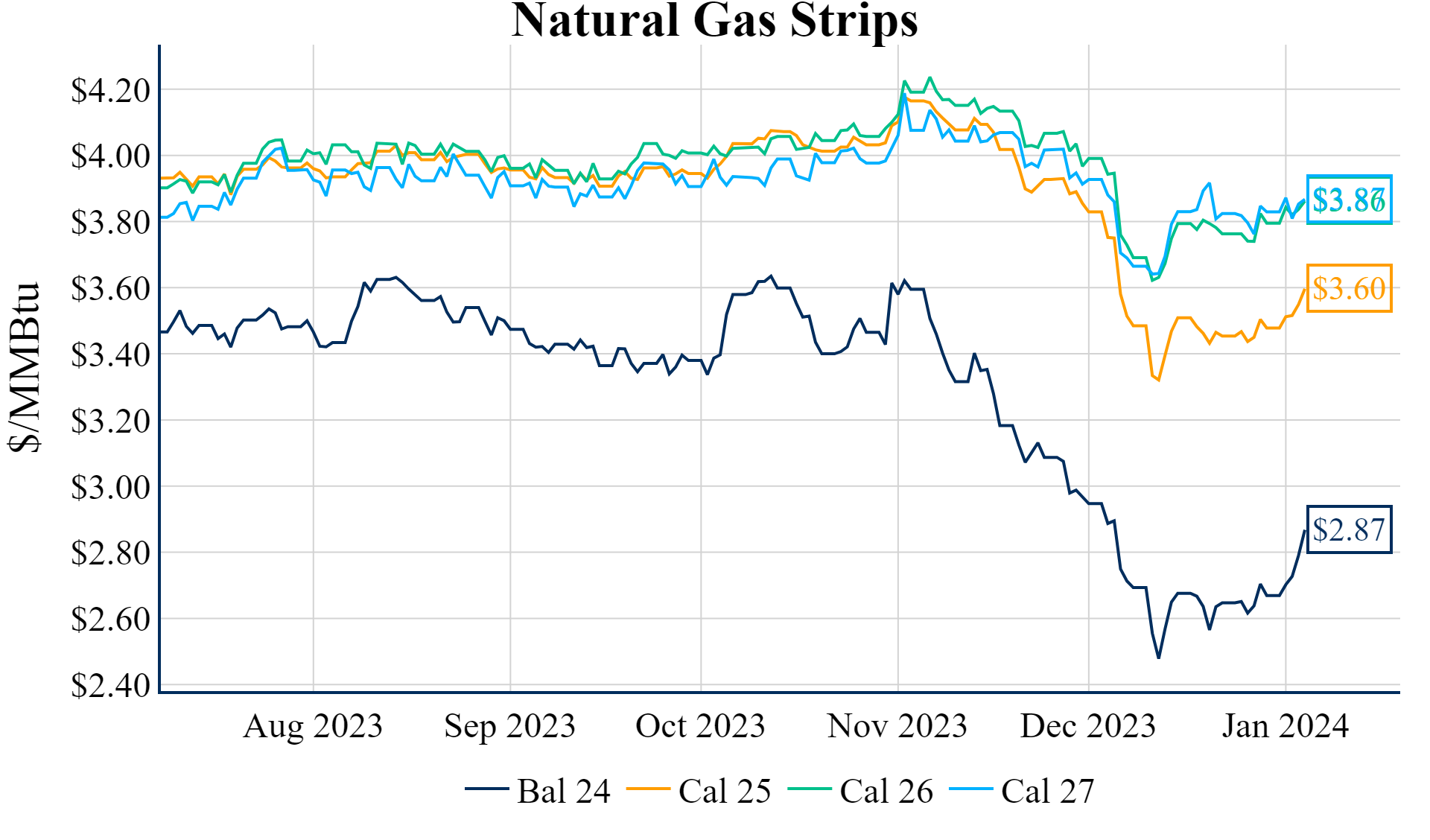 The Winter ‘23/’24 strip is up 13.1c to $2.703, and the Summer ’24 strip is up 7.1c to $2.750