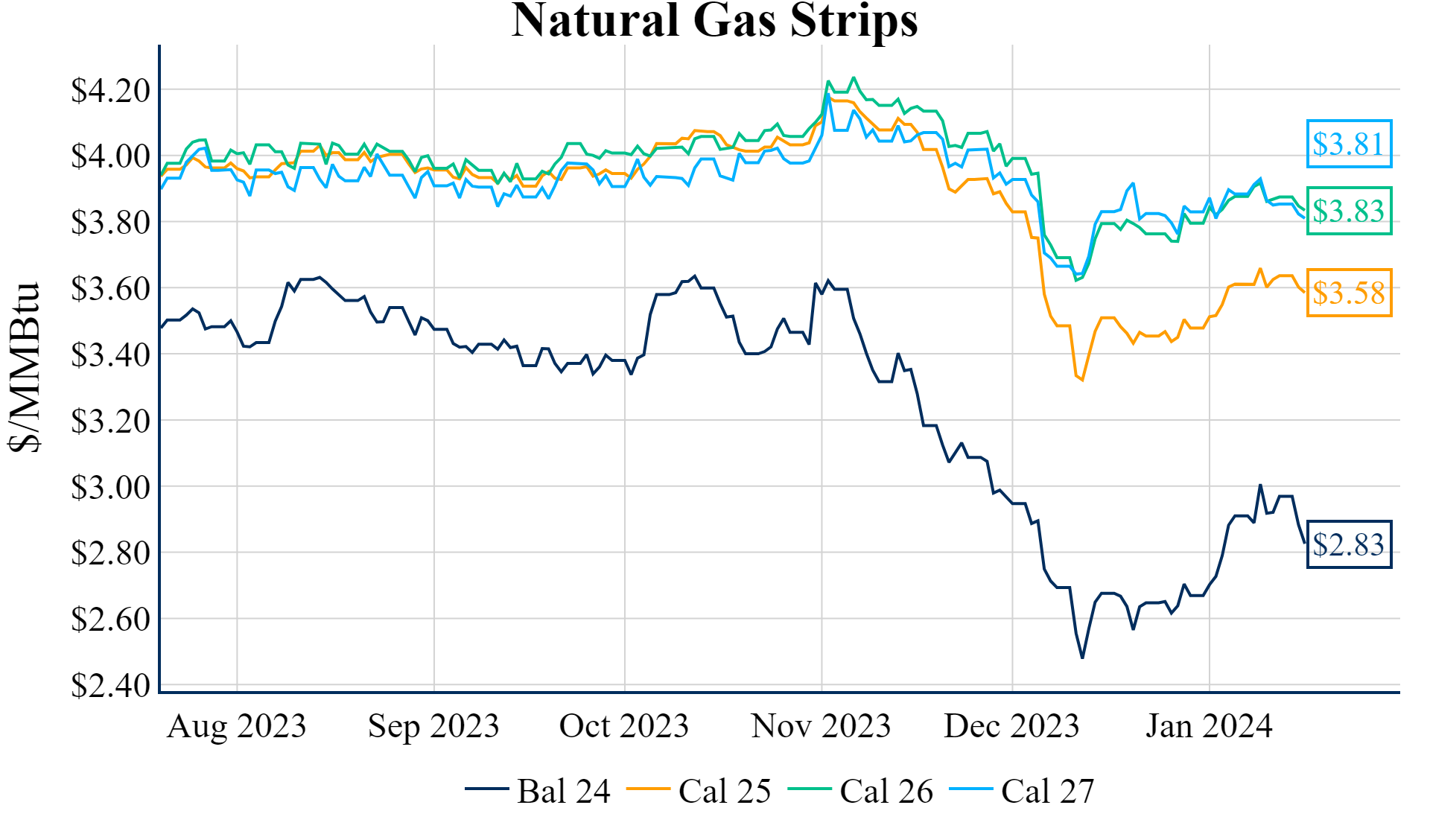 The Winter ‘23/’24 strip is down 10.6c to $2.747, and the Summer ’24 strip is down 5.3c to $2.679