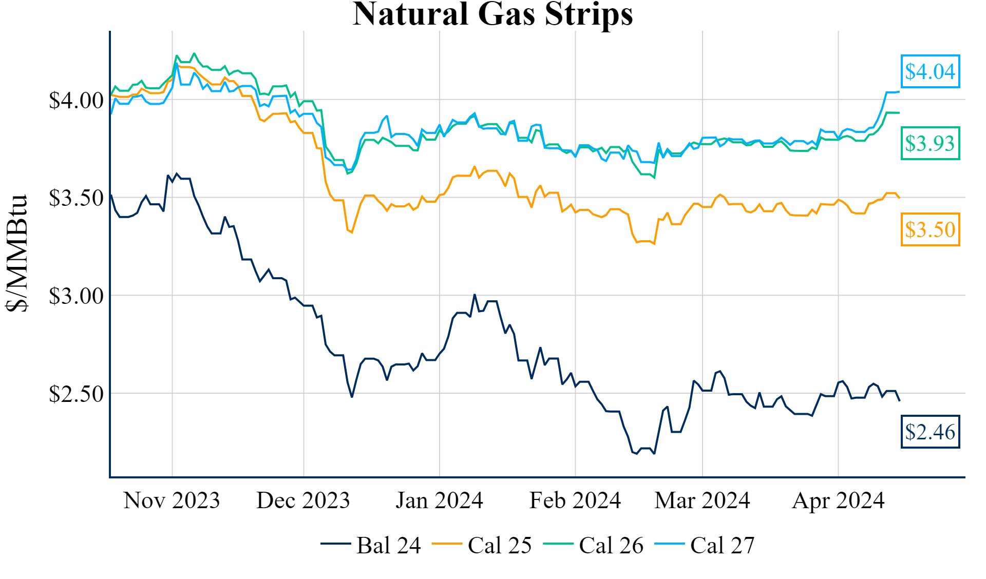 The Summer ’24 strip is down 5.3c to $2.218 and Winter ‘24/’25 strip is down 4.3c to $3.376