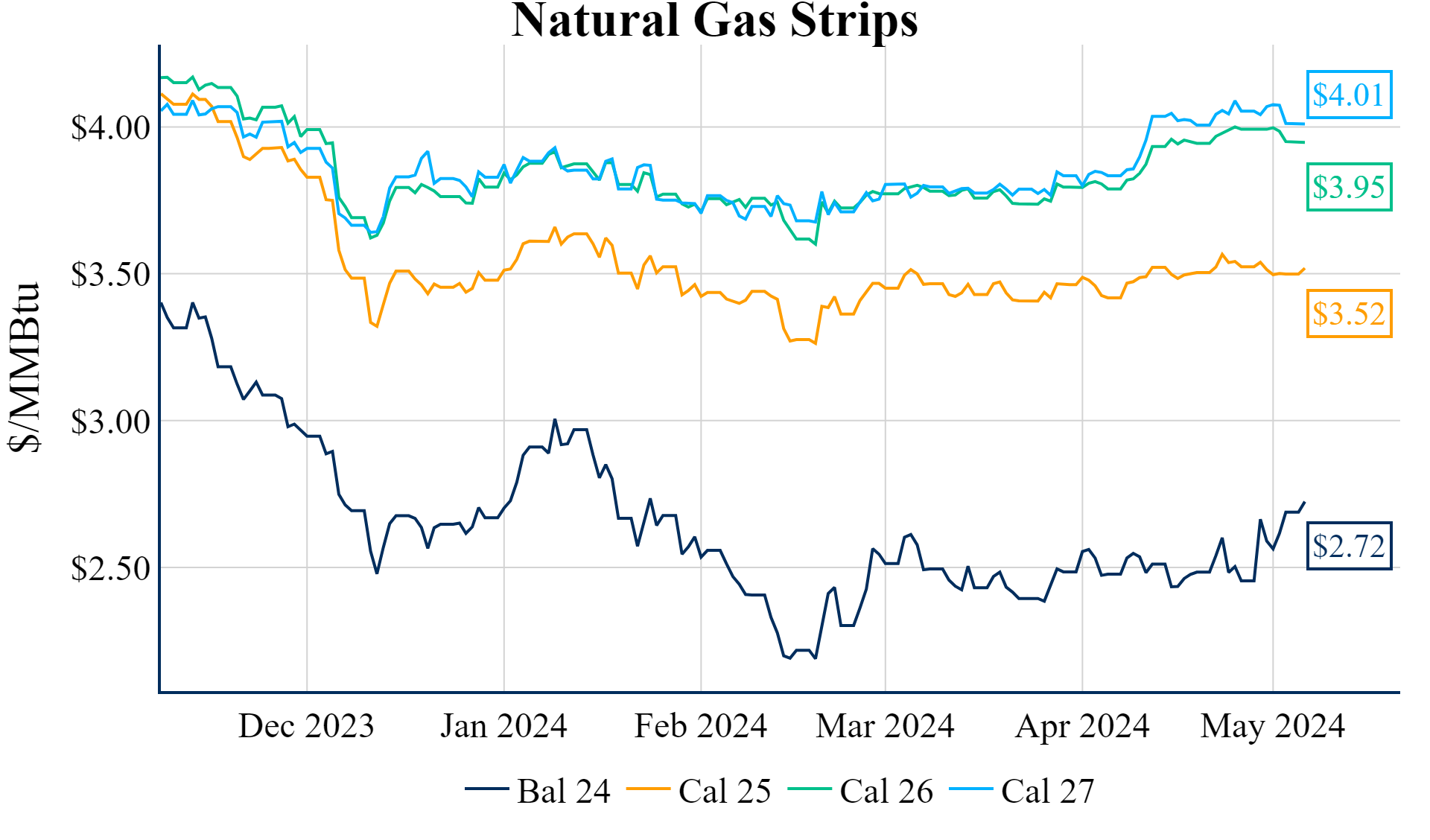 The Summer ’24 strip is up 5.1c to $2.479 and Winter ‘24/’25 strip is up 3.5c to $3.475