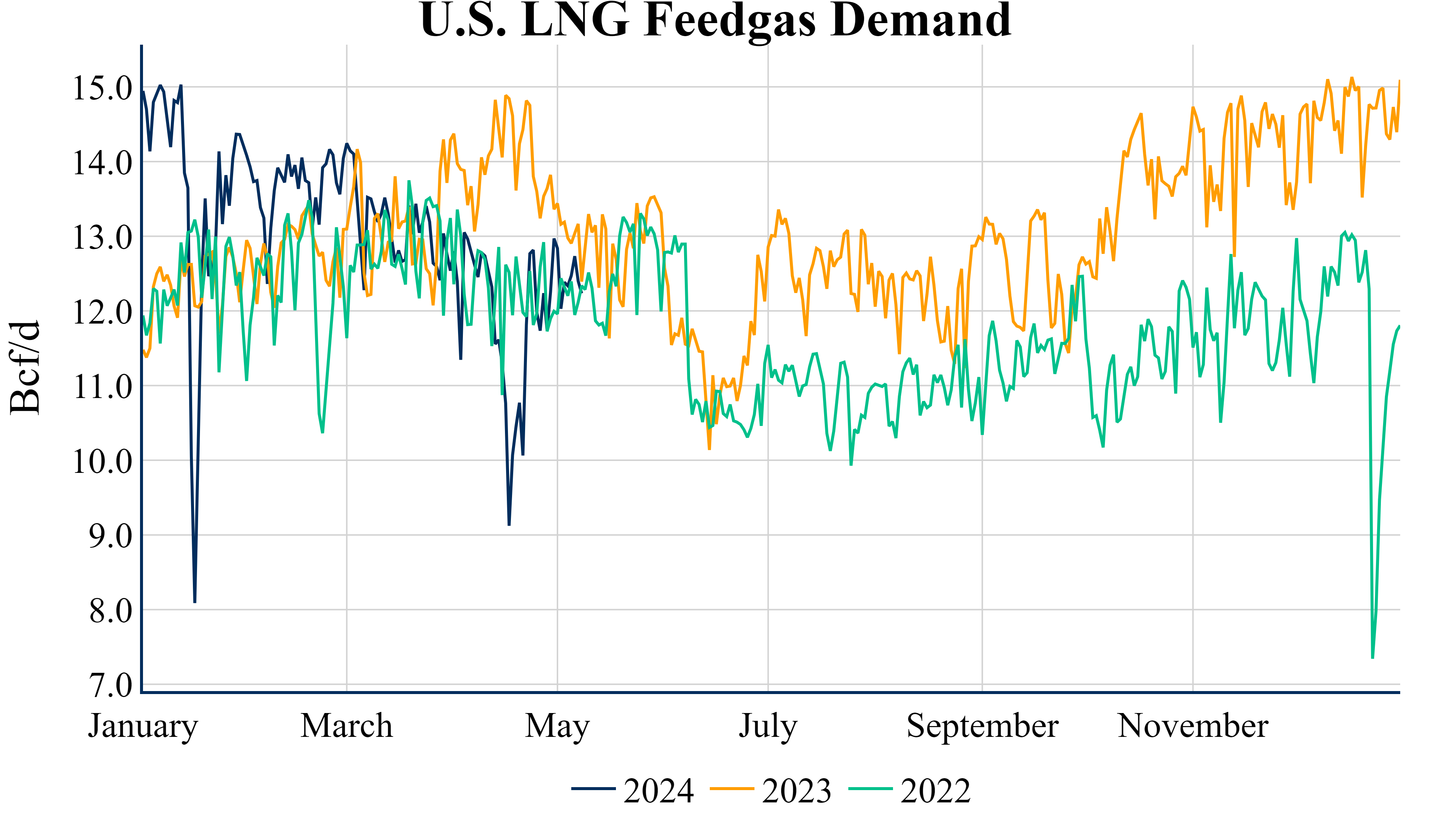 Previous major maintenance at Sabine Pass lasted 20-30 days in 2023 as part of a six-year cycle, and recent outages at Freeport and Cameron LNG have impacted US LNG feedgas demand, which is hovering around 12 Bcf/d