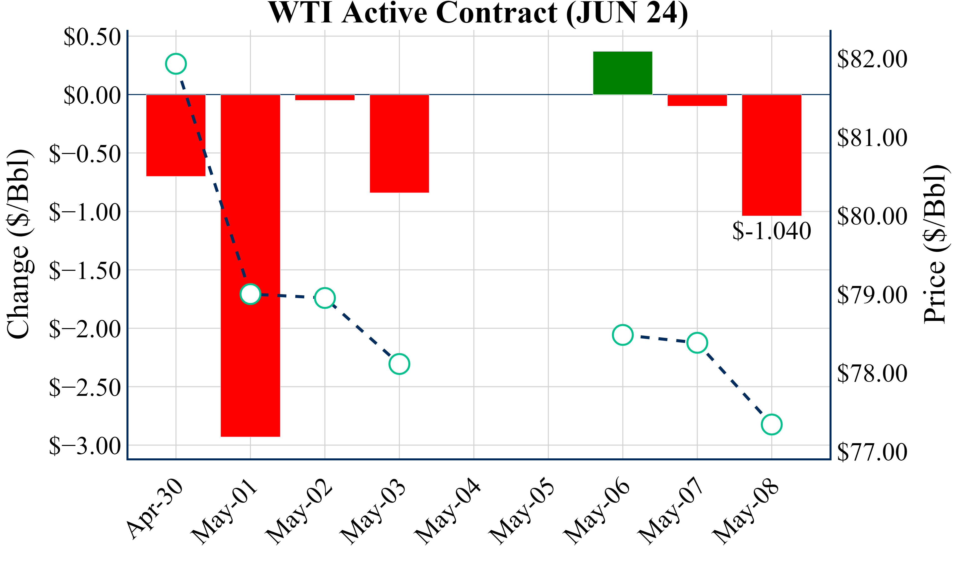 WTI continued yesterday’s selloff during overnight trading, falling as low as $77 before rebounding slightly