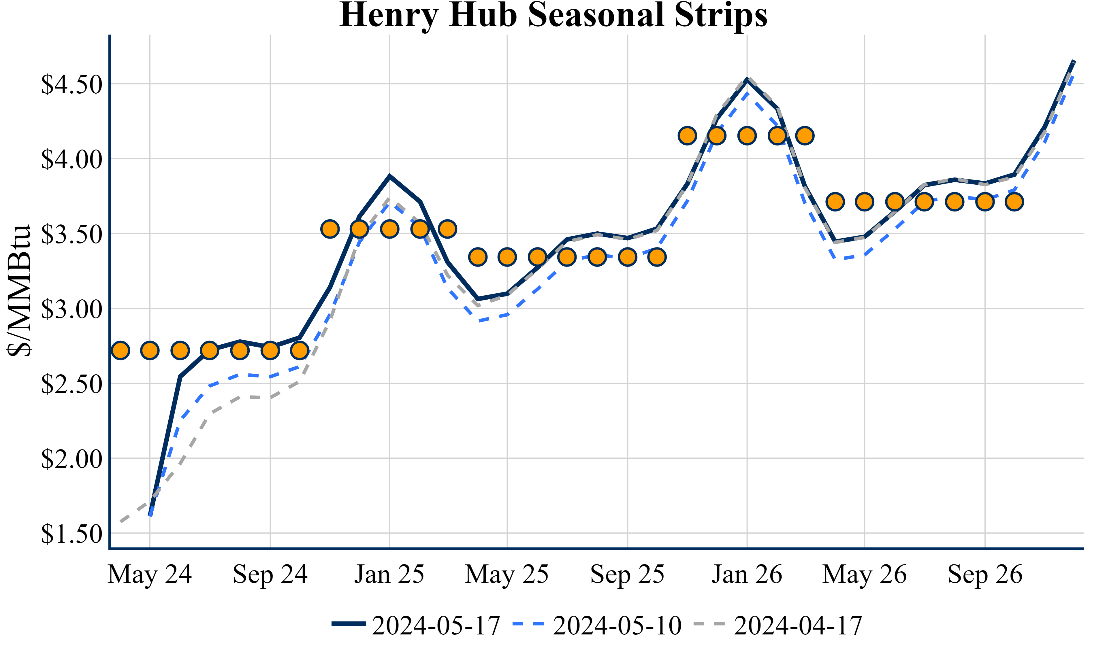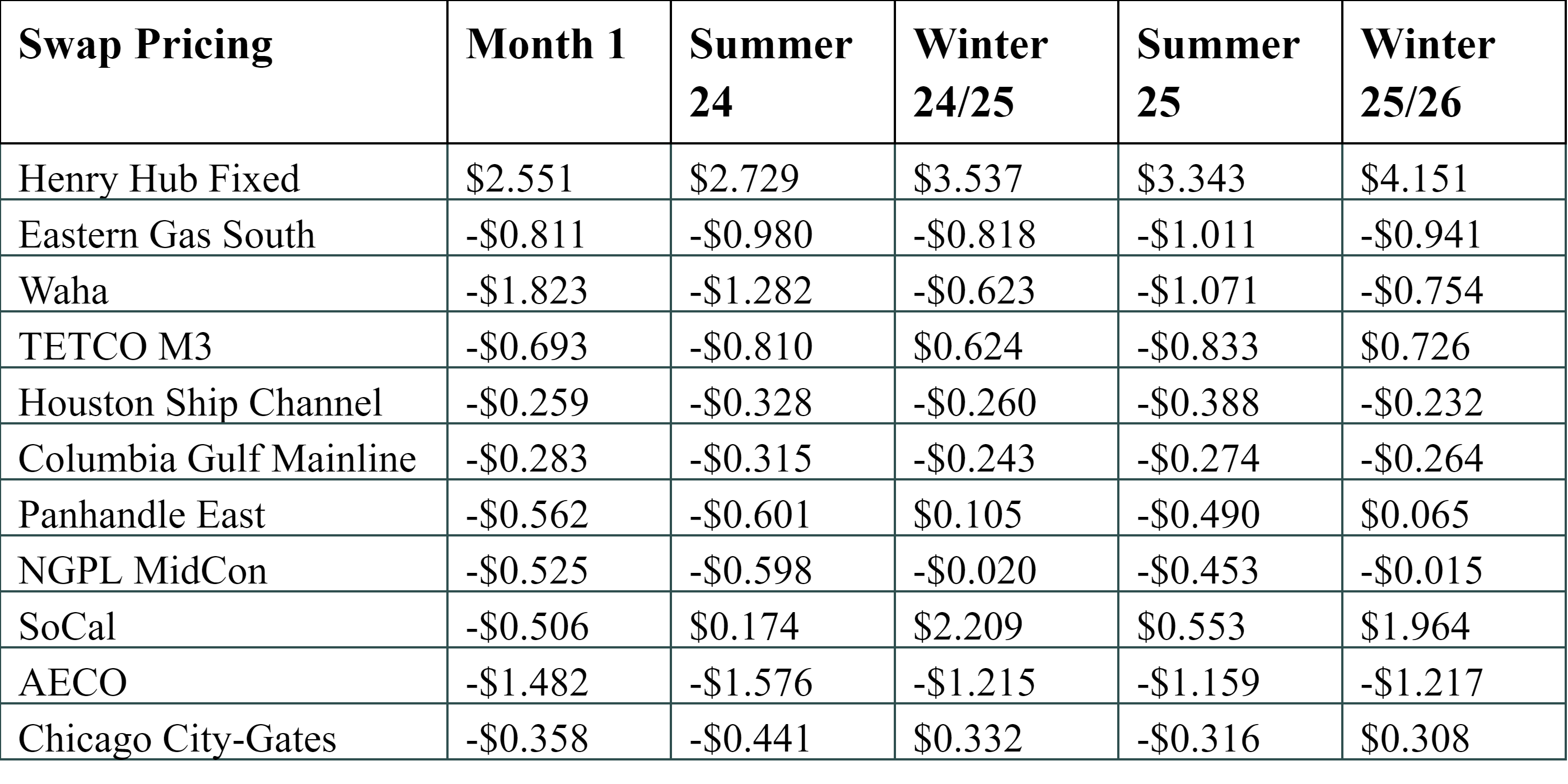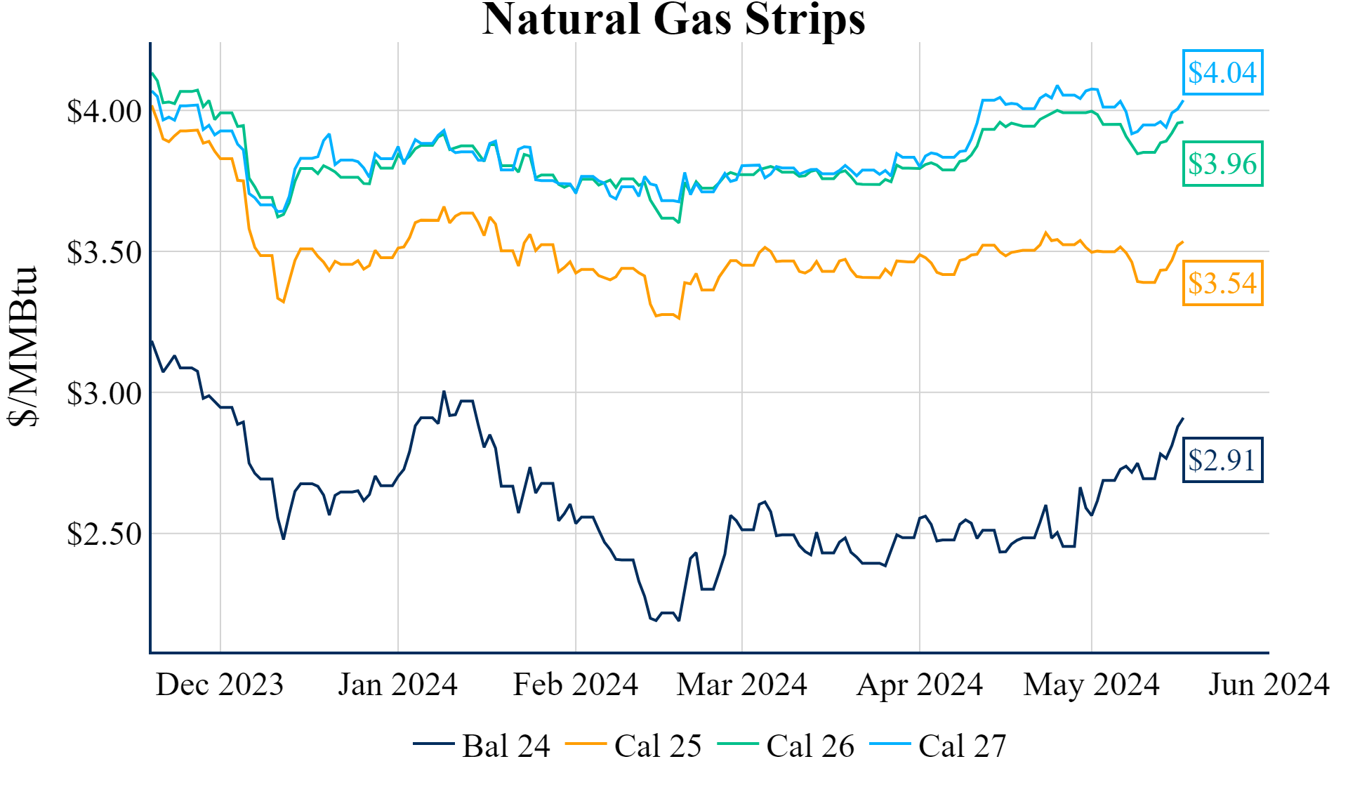 The Summer ’24 strip is up 3.5c to $2.719 and Winter ‘24/’25 strip is up 2.2c to $3.533