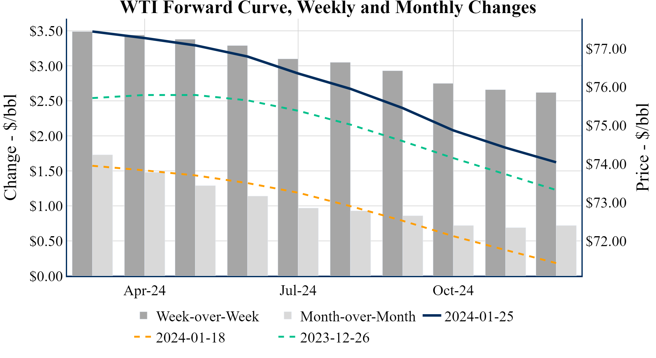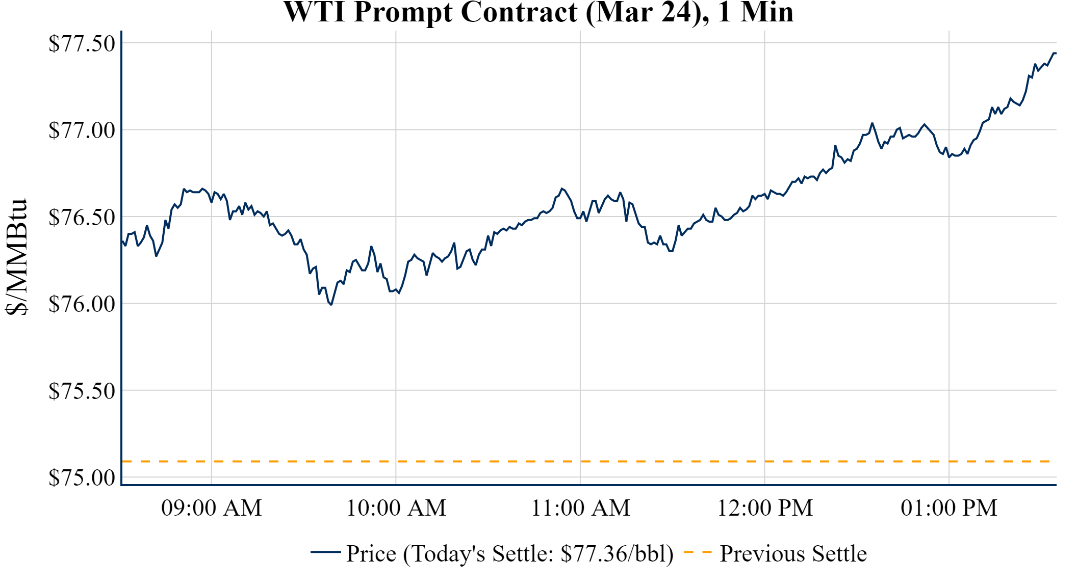 Prompt-Month WTI (Mar 24) was up $2.27 on the day, to settle at $77.36
