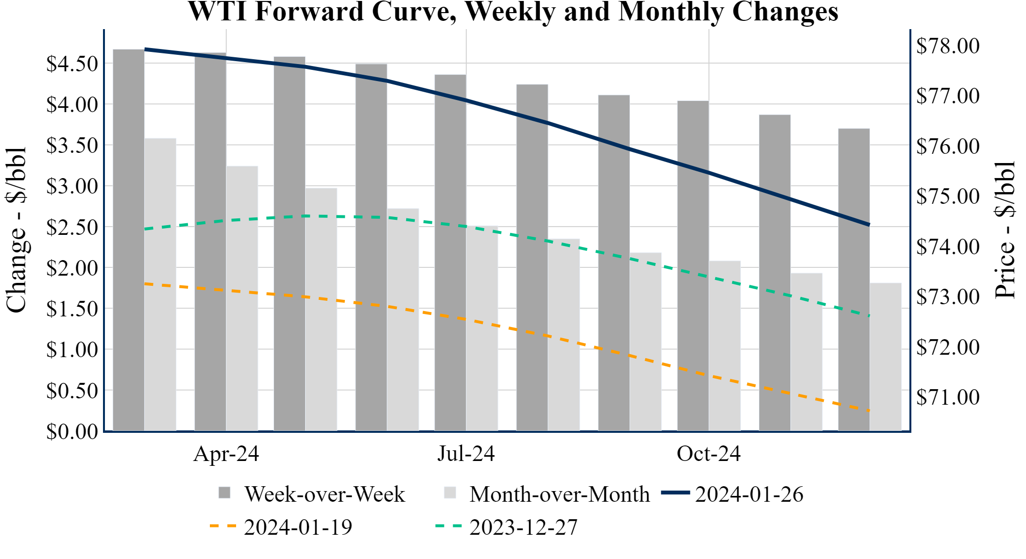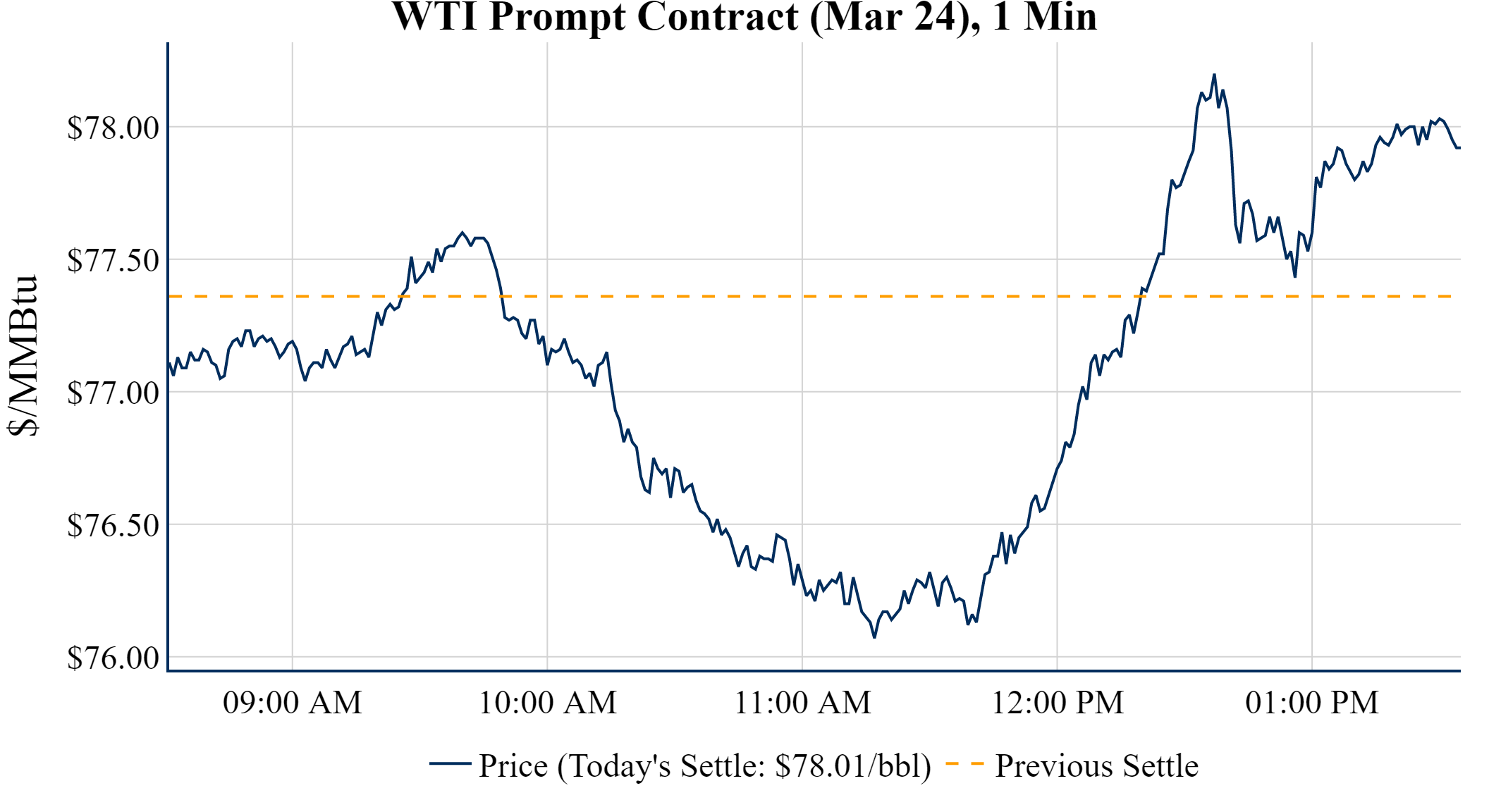 Prompt-Month WTI (Mar 24) was up $0.65 on the day, to settle at $78.01