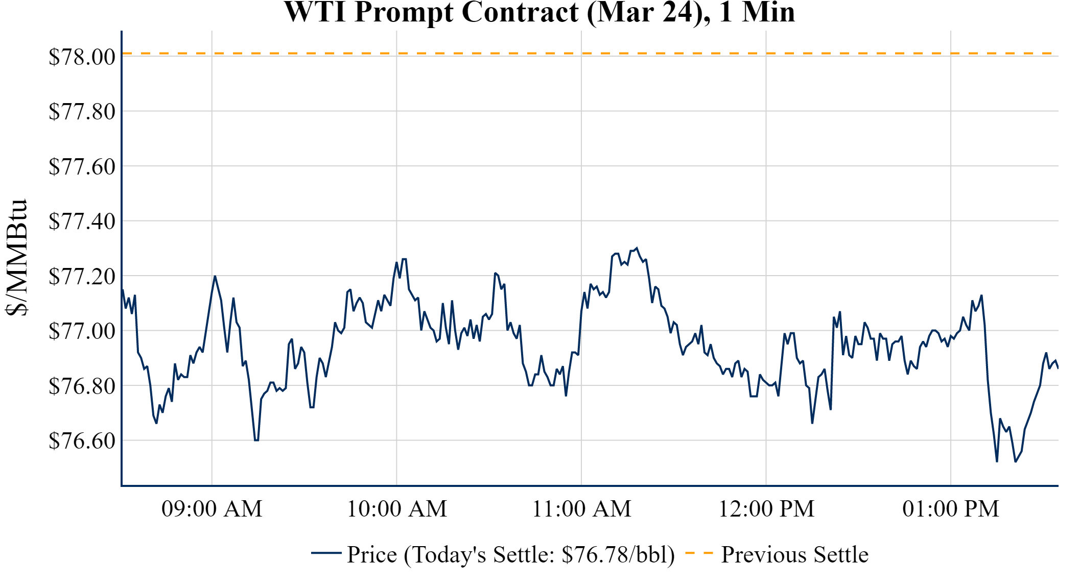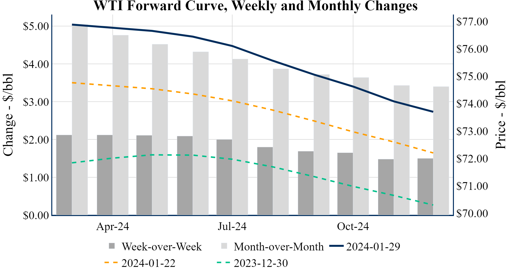 Prompt-Month WTI (Mar 24) was down $-1.23 on the day, to settle at $76.78