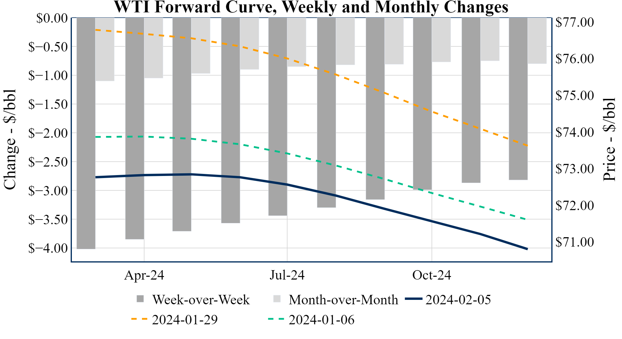 Prompt-Month WTI (Mar 24) was up $0.50 on the day, to settle at $72.78