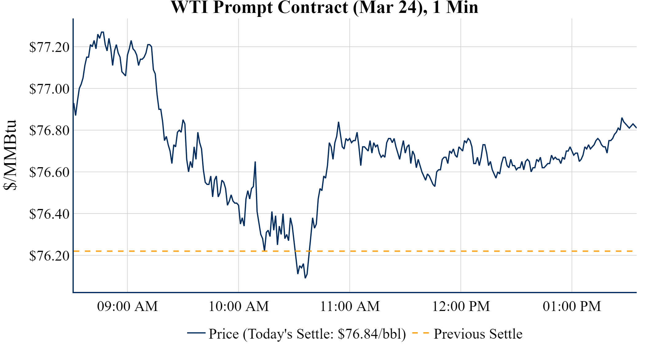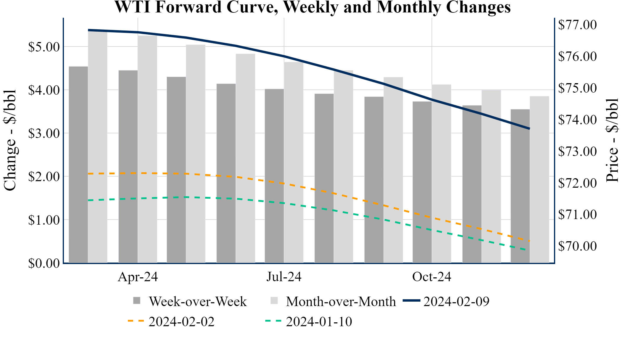 Prompt-Month WTI (Mar 24) was up $0.62 on the day, to settle at $76.84