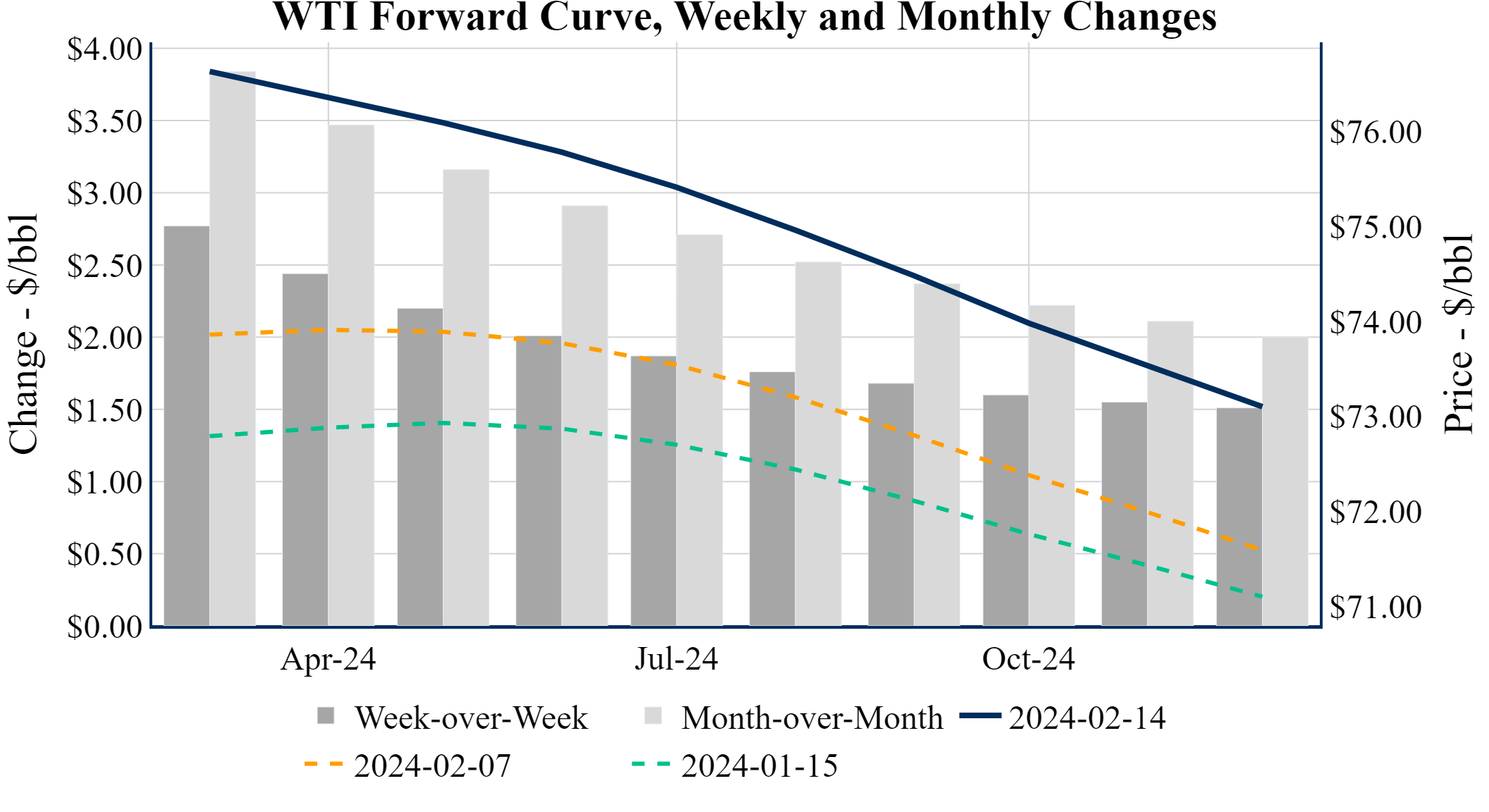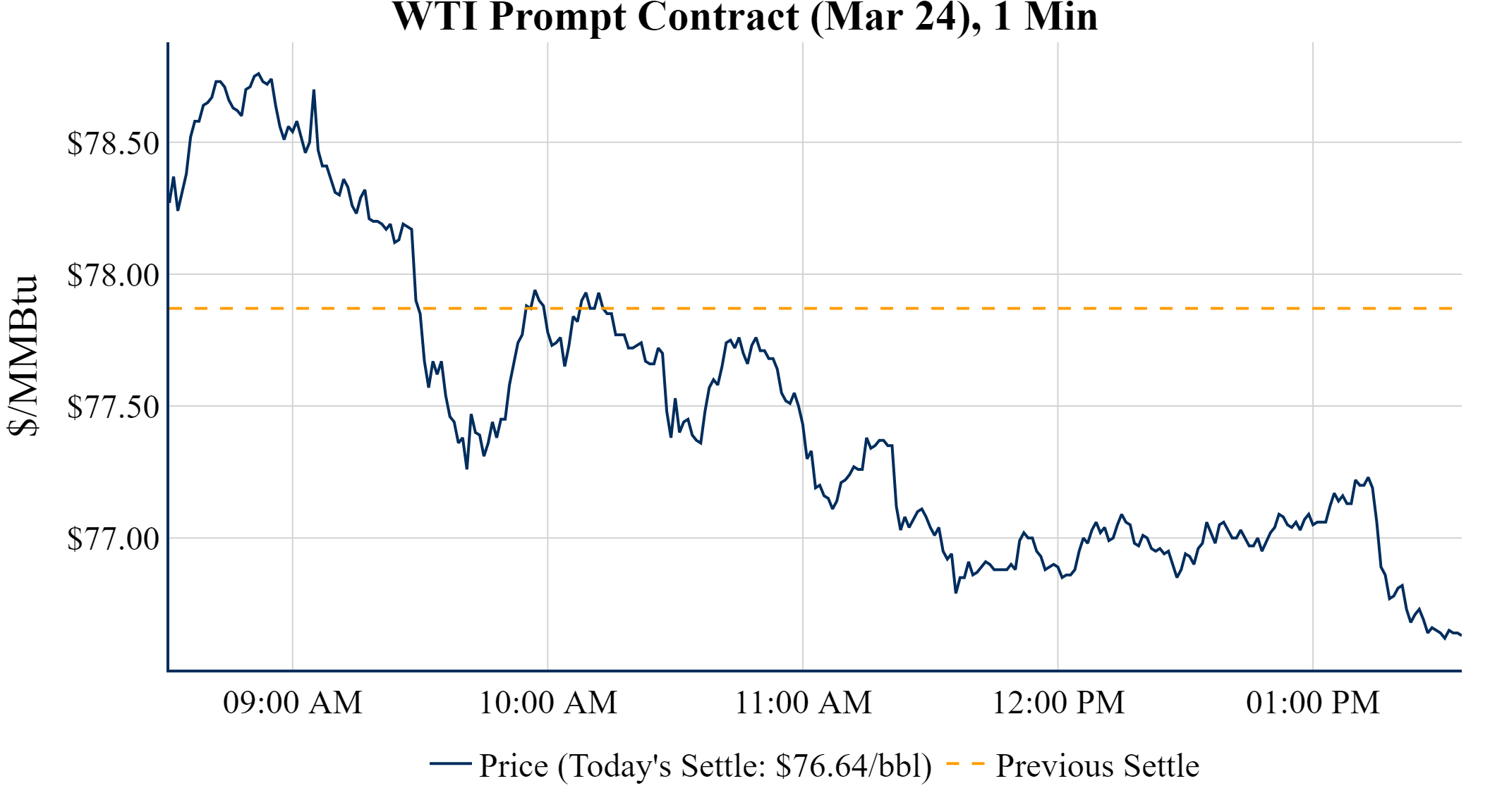 Prompt-Month WTI (Mar 24) was down $-1.23 on the day, to settle at $76.64