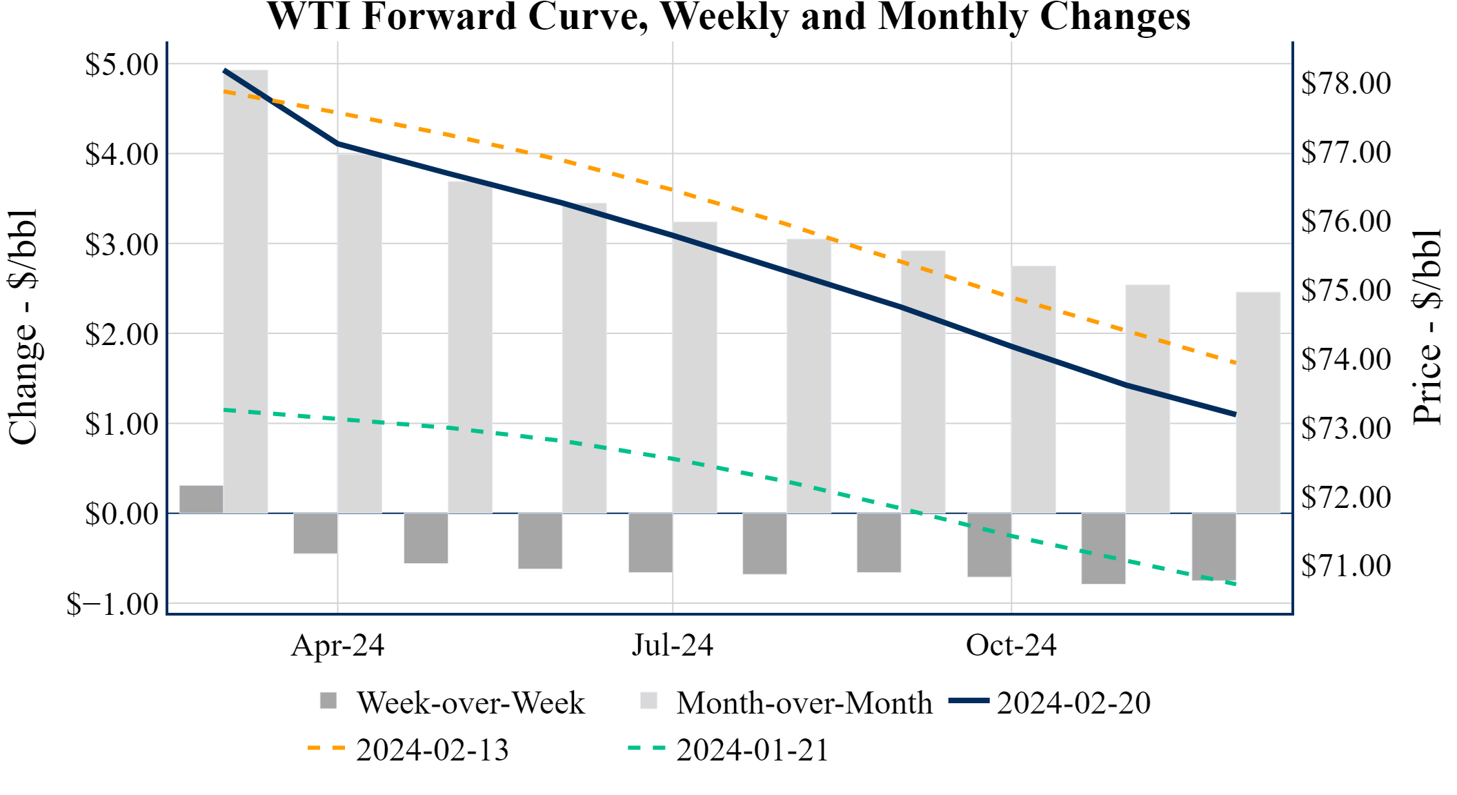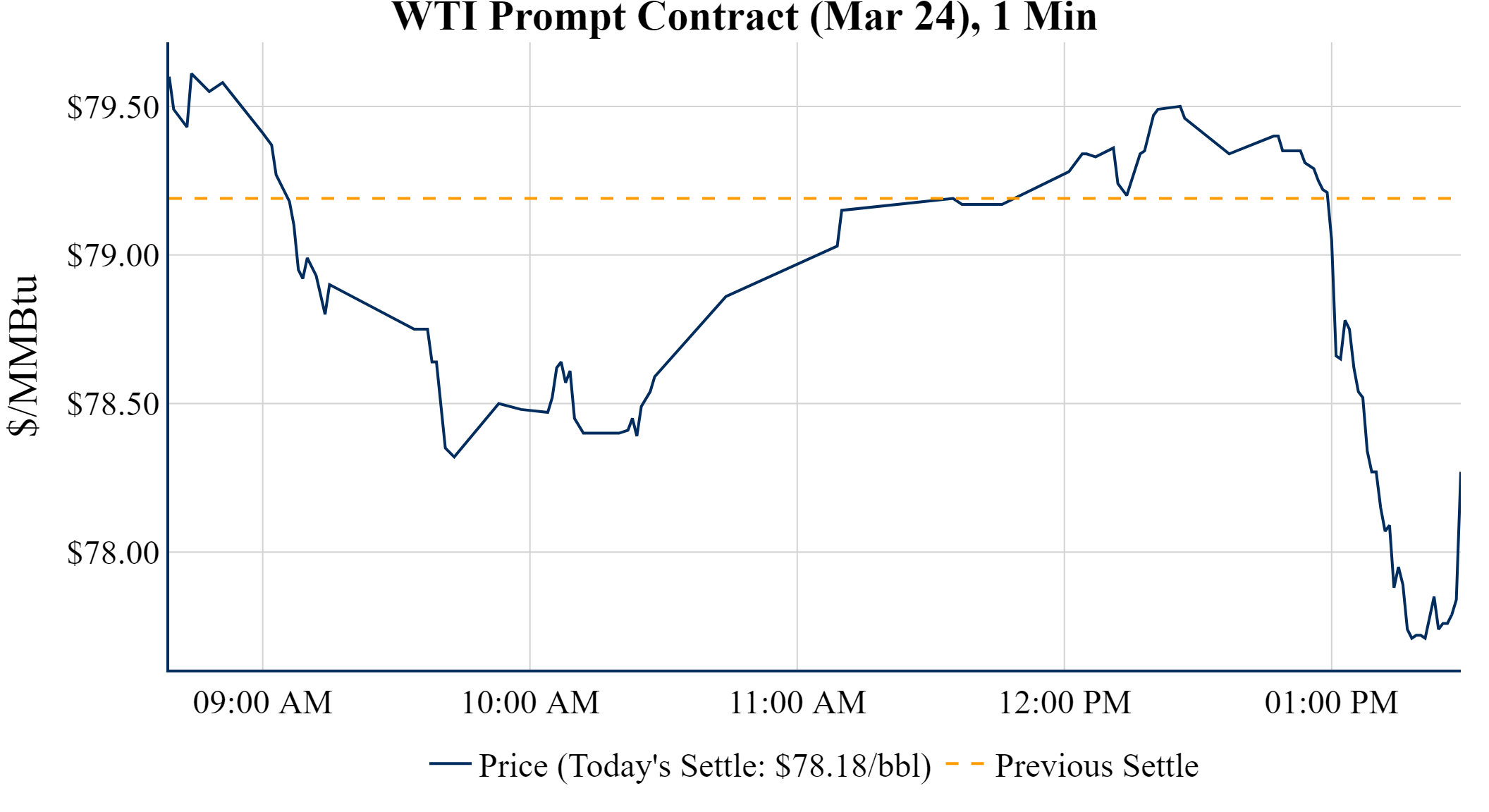 Prompt-Month WTI (Mar 24) was down $-1.01 on the day, to settle at $78.18