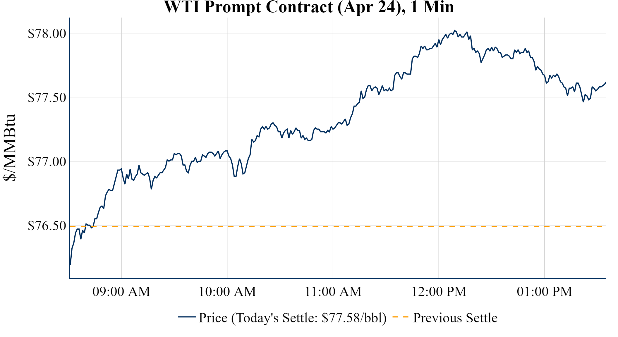 Prompt-Month WTI (Apr 24) was up $1.09 on the day, to settle at $77.58