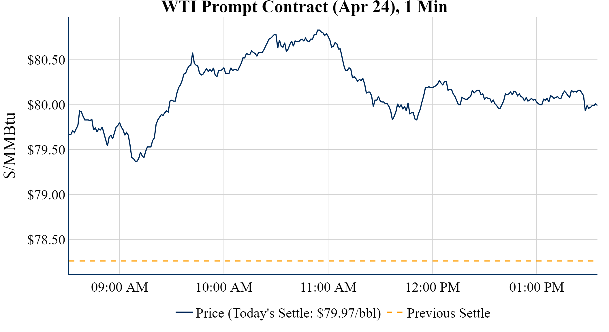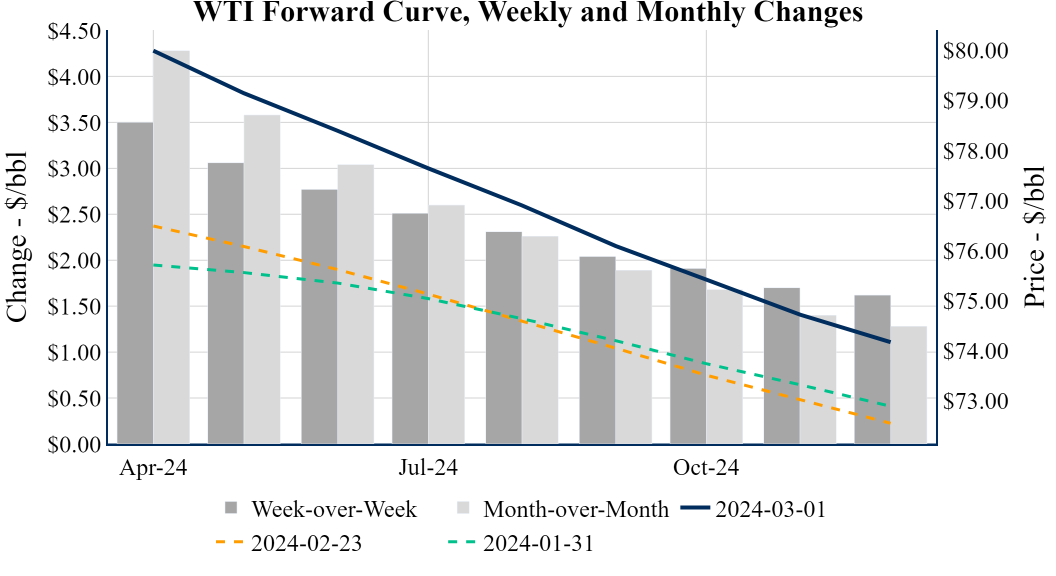 Prompt-Month WTI (Apr 24) was up $1.71 on the day, to settle at $79.97