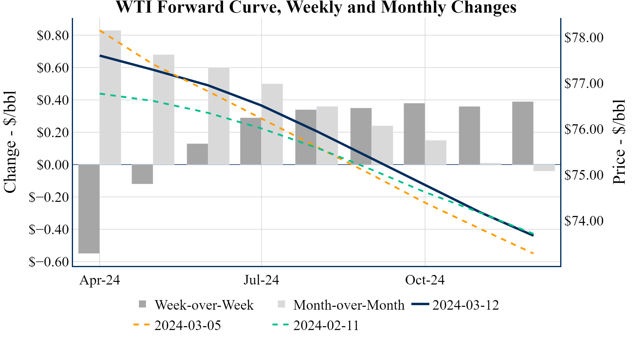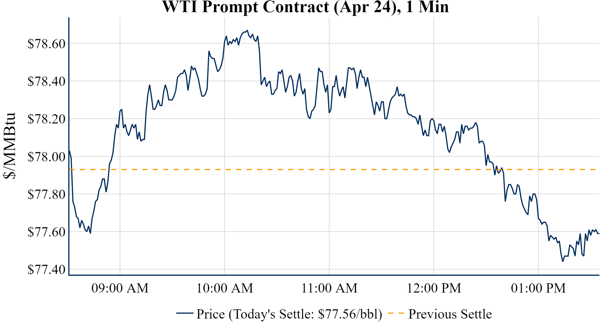 Prompt-Month WTI (Apr 24) was down $-0.37 on the day, to settle at $77.56