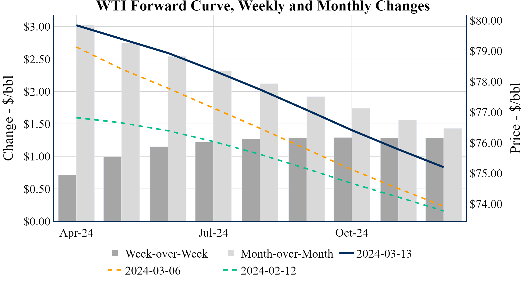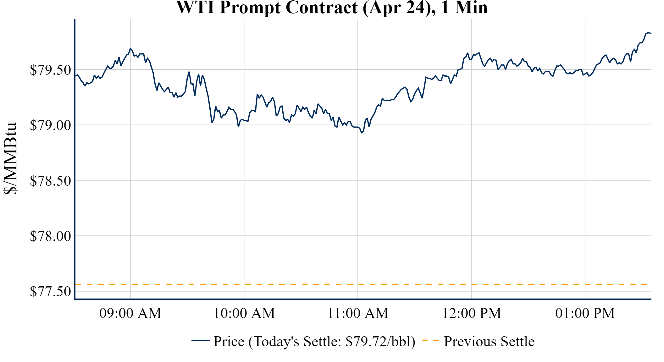 Prompt-Month WTI (Apr 24) was up $2.16 on the day, to settle at $79.72