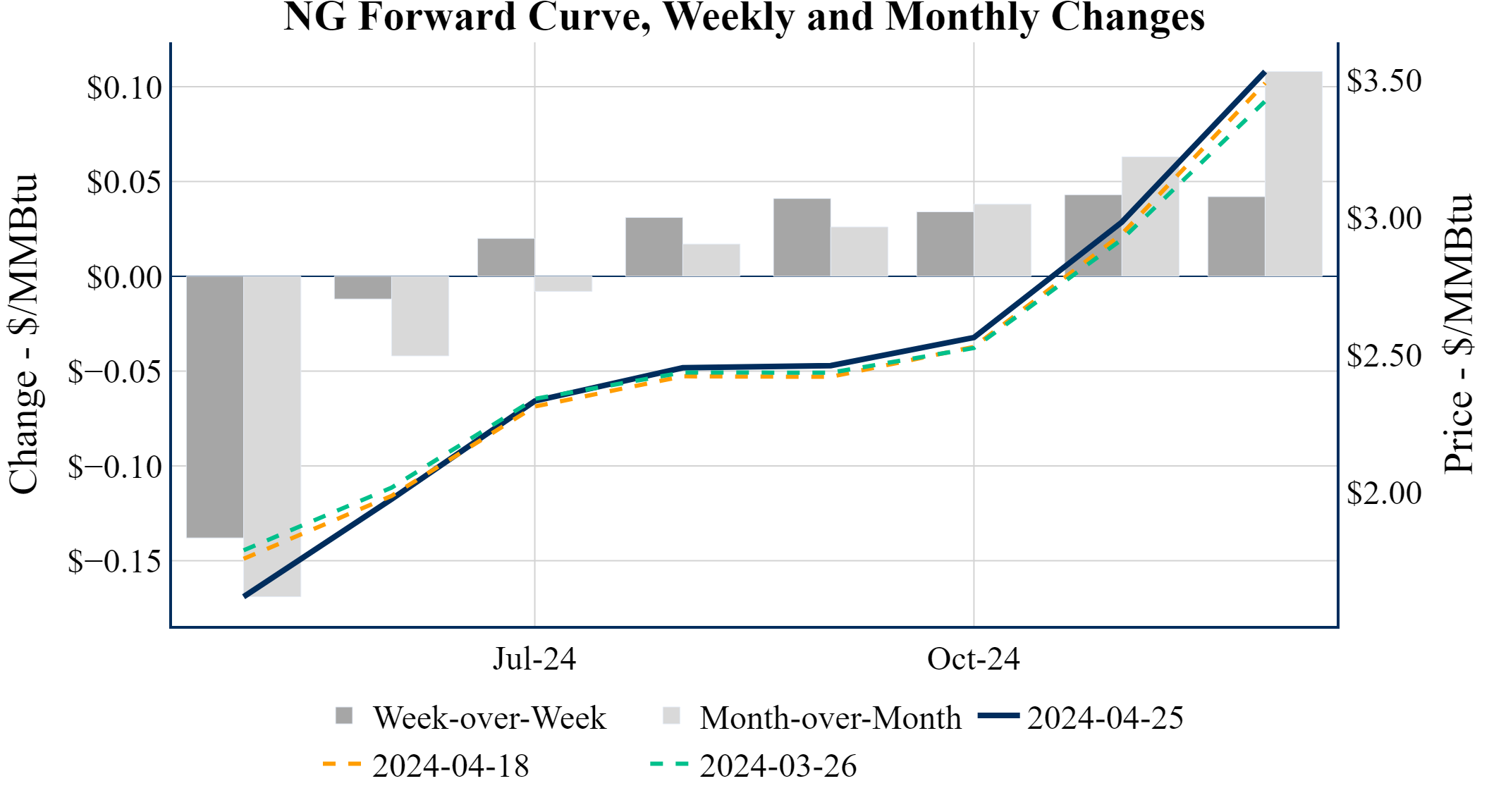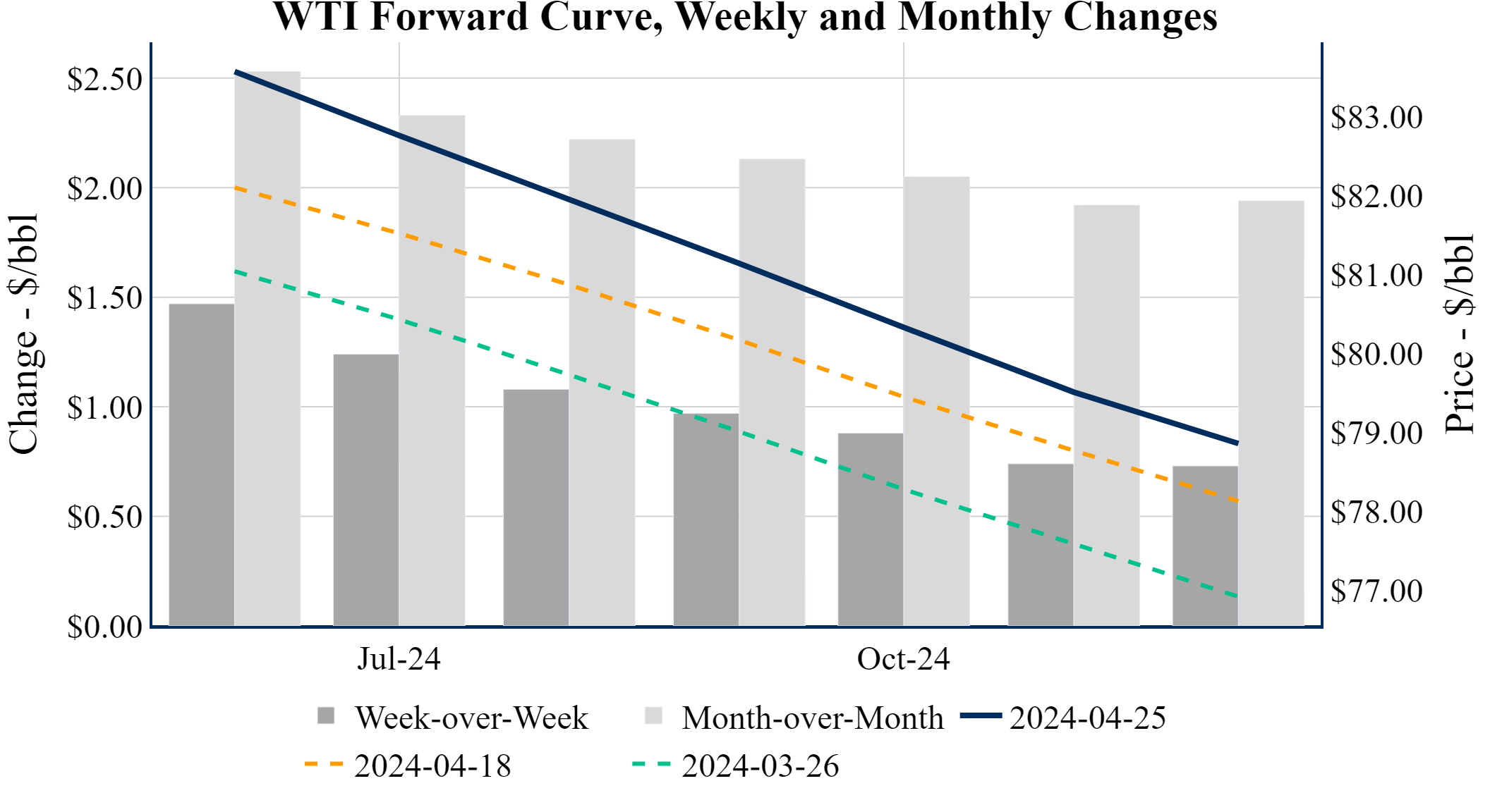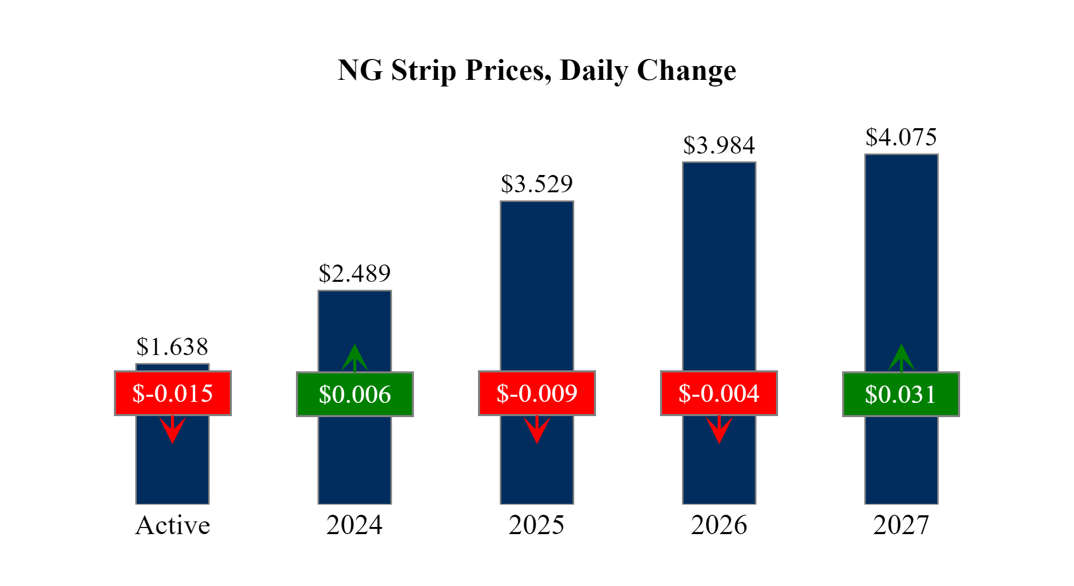 Prompt-Month Henry Hub (May 24) was down $-0.015 on the day, to settle at $1.638 Prompt-Month WTI (Jun 24) was up $0.76 on the day, to settle at $83.57