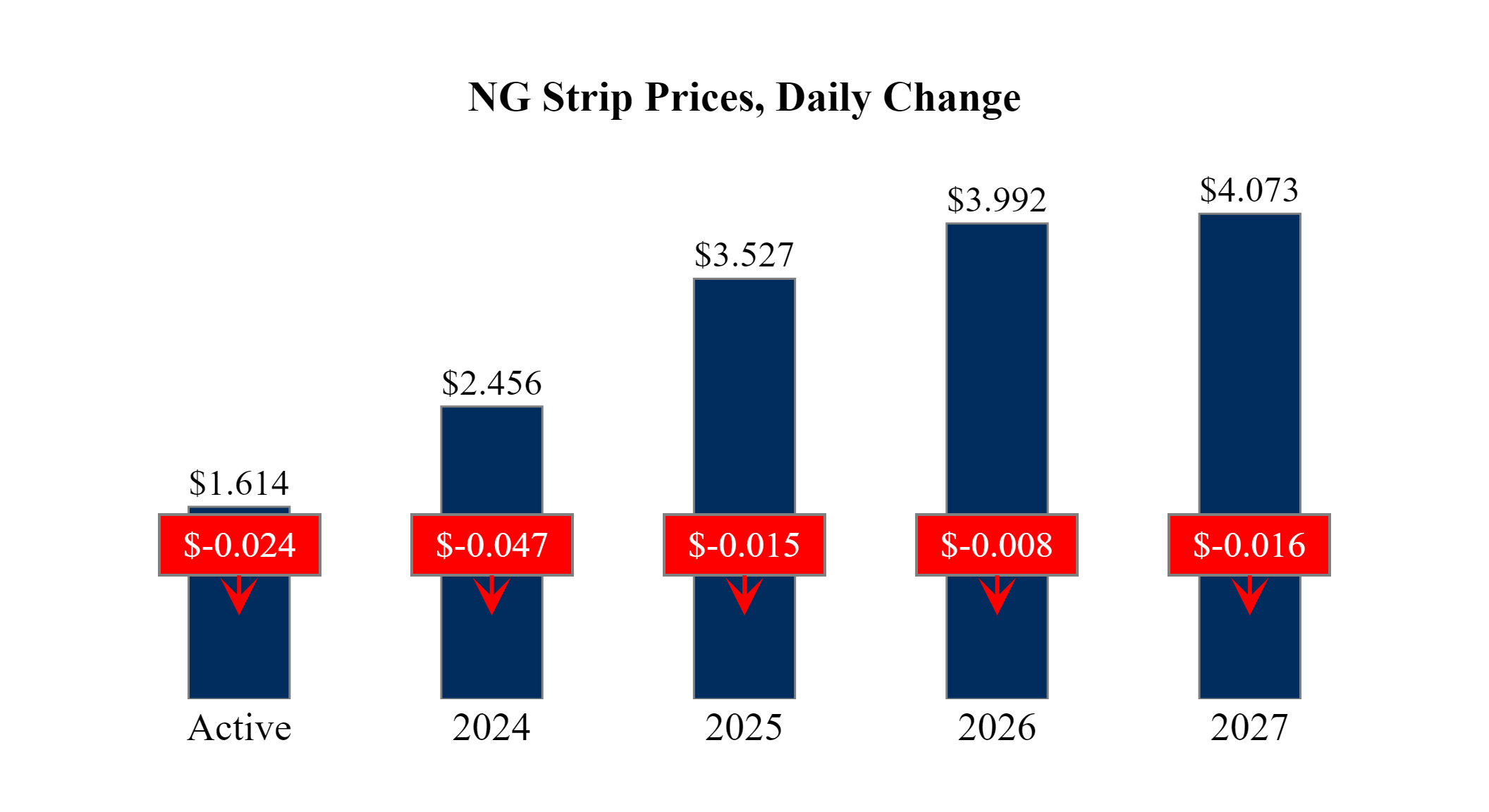 Prompt-Month Henry Hub (May 24) was down $-0.024 on the day, to settle at $1.614 Prompt-Month WTI (Jun 24) was up $0.28 on the day, to settle at $83.85
