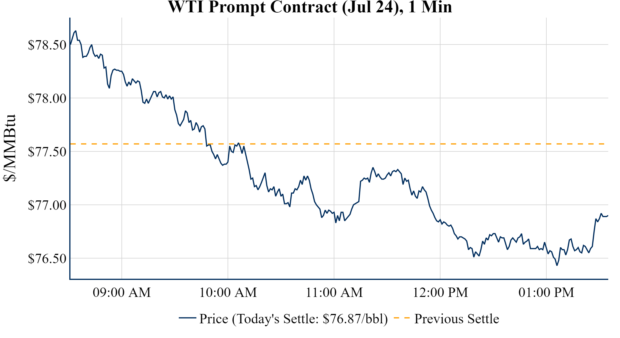 Prompt-Month WTI (Jul 24) was down $-0.70 on the day, to settle at $76.87