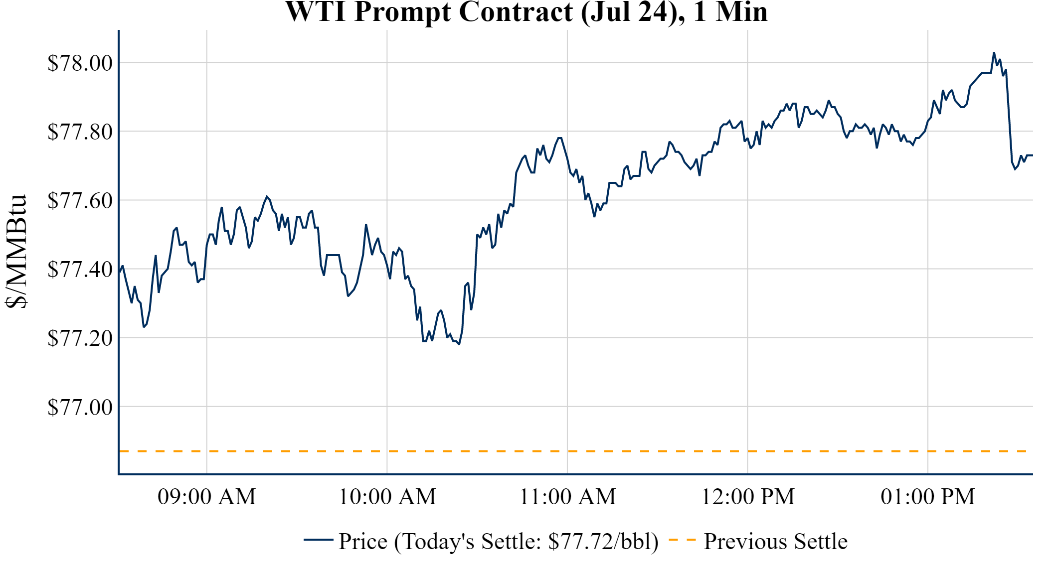 Prompt-Month WTI (Jul 24) was up $0.85 on the day, to settle at $77.72