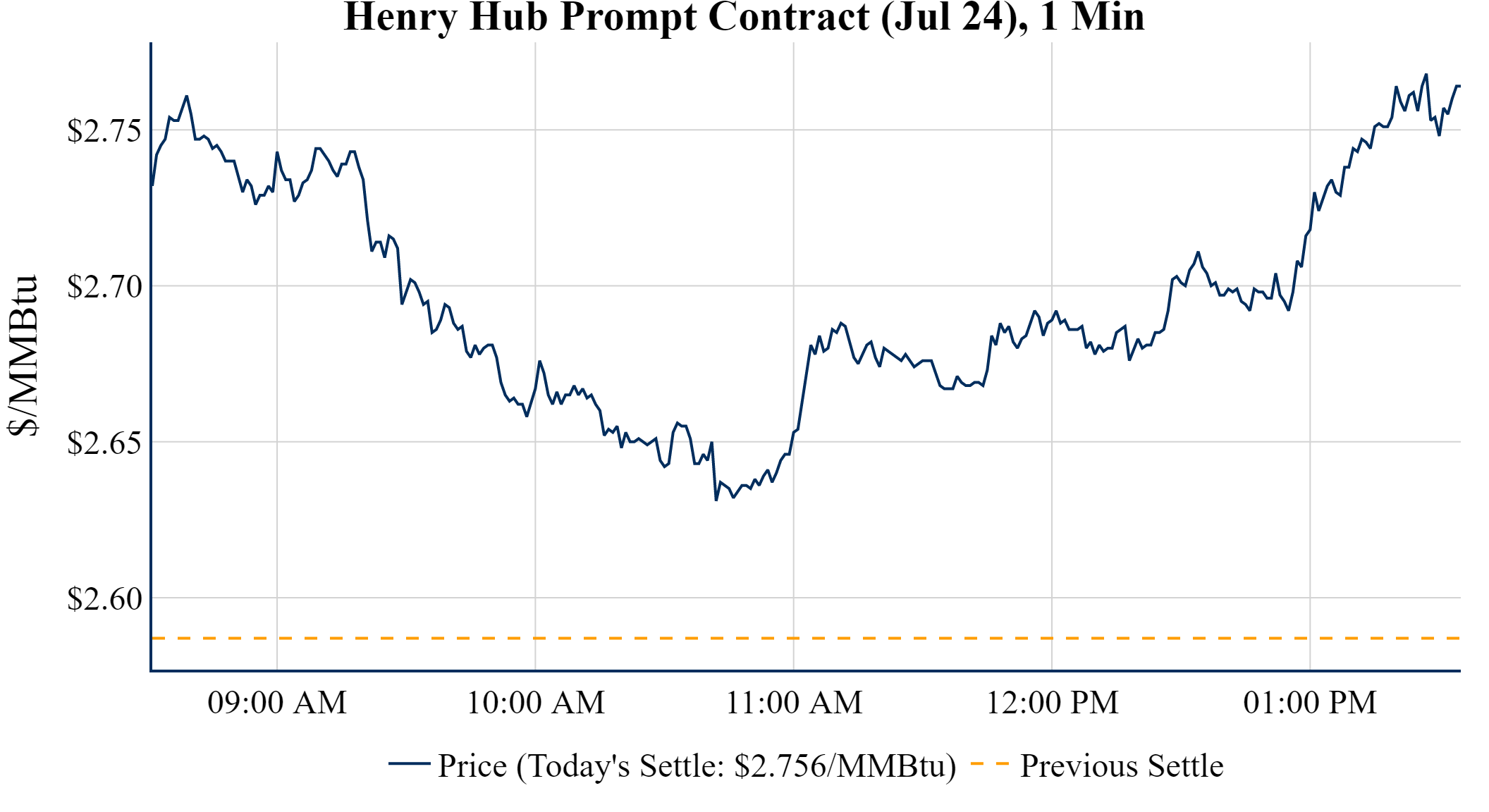 Prompt-Month Henry Hub (Jul 24) was up $0.169 on the day, to settle at $2.756 Prompt-Month WTI (Jul 24) was down $-2.77 on the day, to settle at $74.22