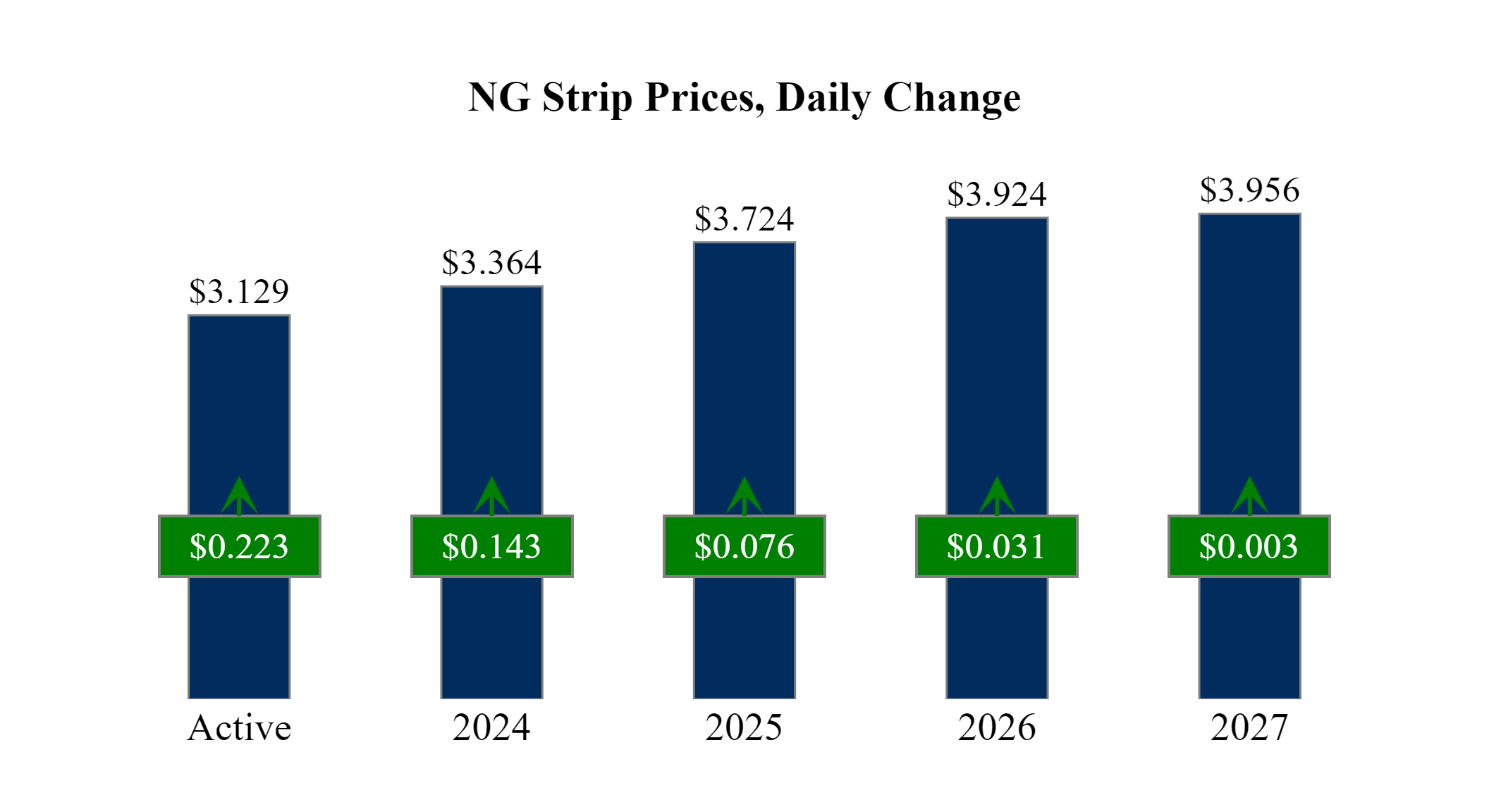 Prompt-Month Henry Hub (Jul 24) was up $0.223 on the day, to settle at $3.129