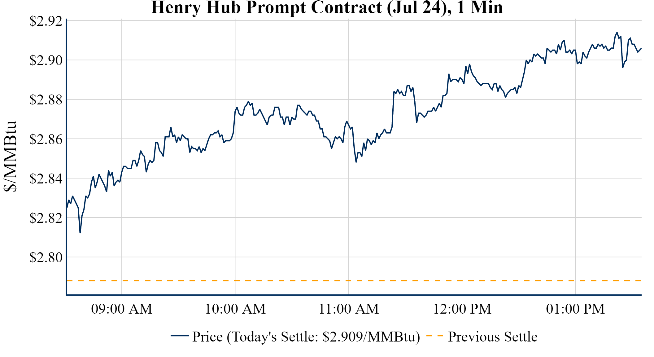 Prompt-Month Henry Hub (Jul 24) was up $0.121 on the day, to settle at $2.909