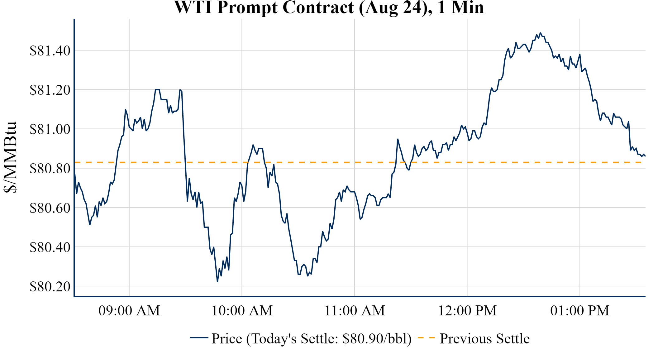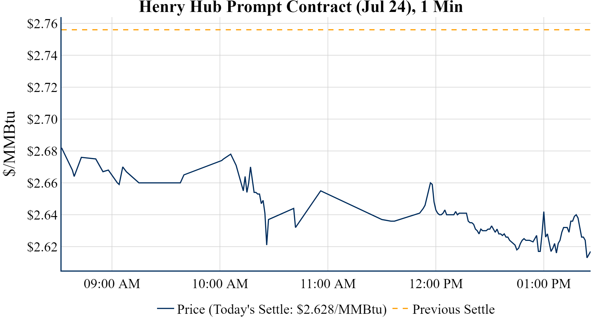 Prompt-Month Henry Hub (Jul 24) was down $-0.128 on the day, to settle at $2.628 Prompt-Month WTI (Aug 24) was up $0.07 on the day, to settle at $80.90