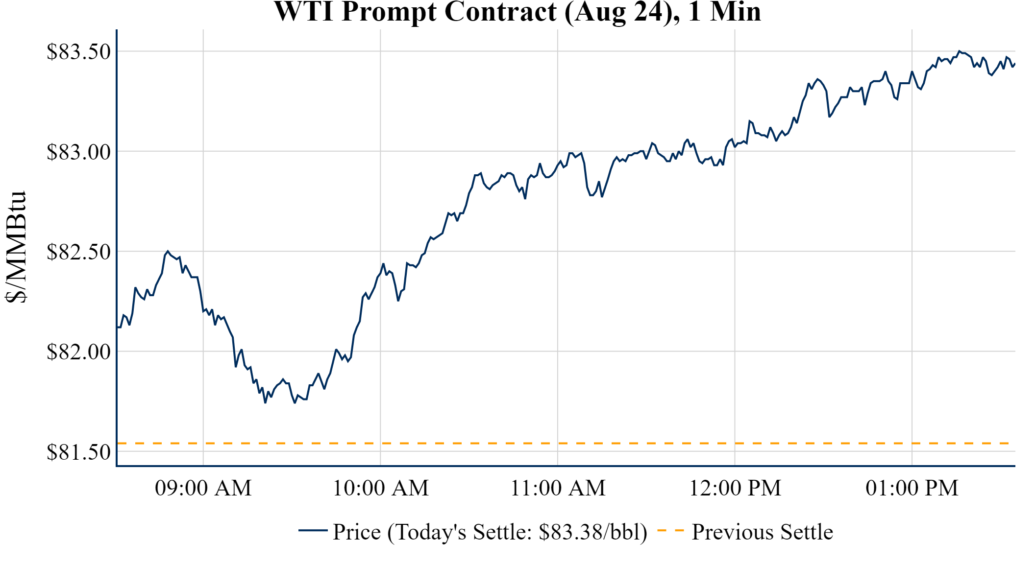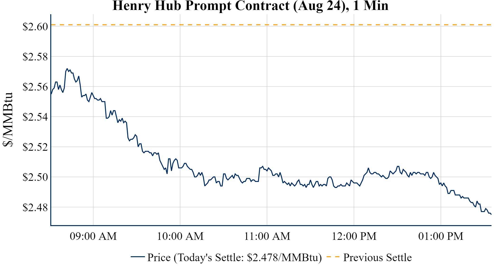 Prompt-Month Henry Hub (Aug 24) was down $-0.123 on the day, to settle at $2.478Prompt-Month WTI (Aug 24) was up $1.84 on the day, to settle at $83.38