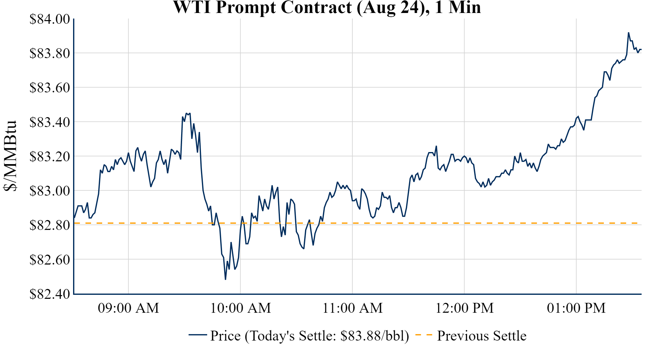 Prompt-Month WTI (Aug 24) was up $1.07 on the day, to settle at $83.88
