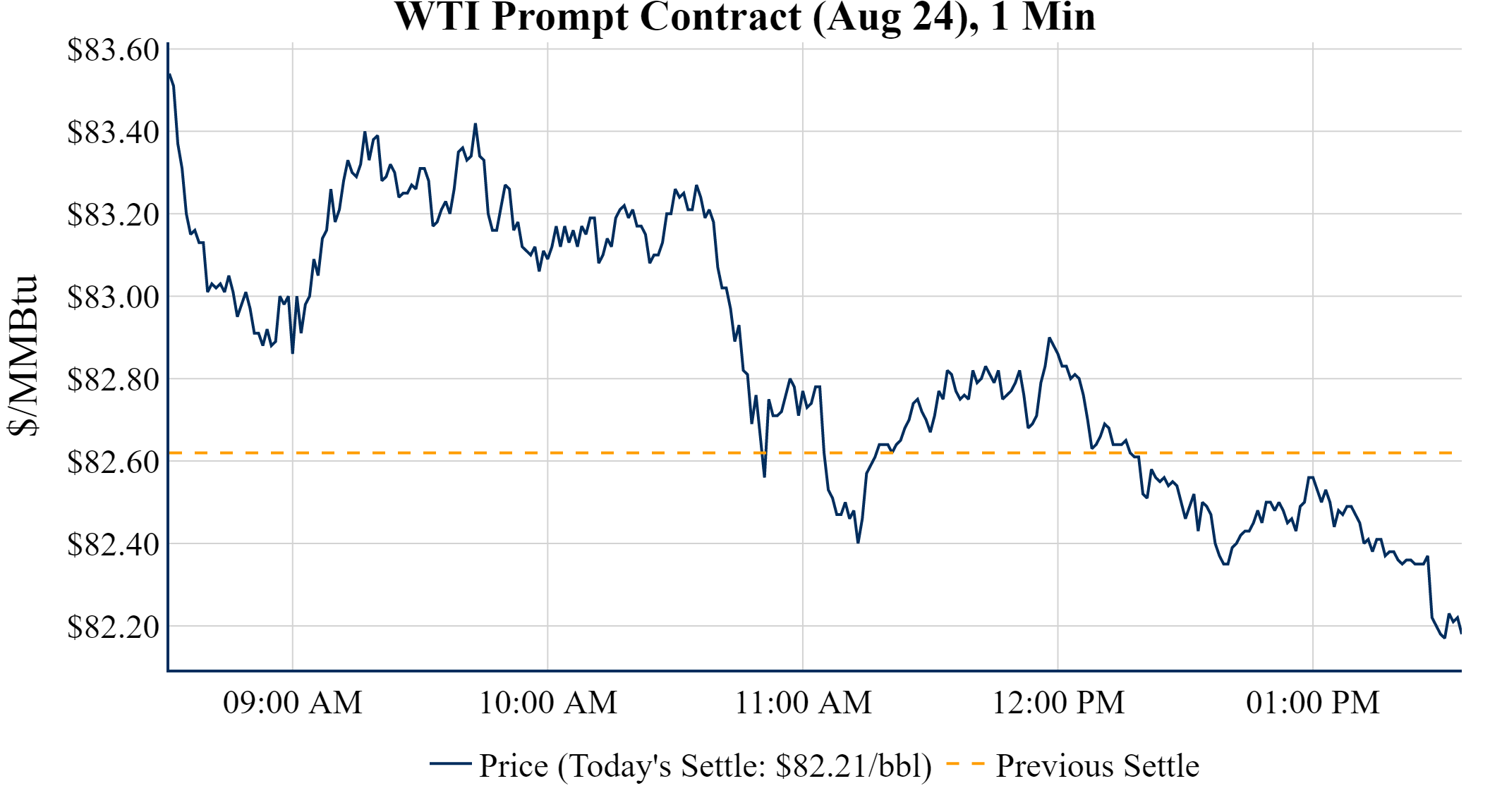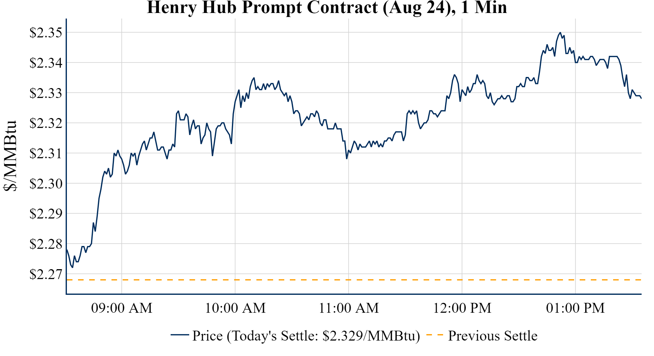 Prompt-Month Henry Hub (Aug 24) was up $0.061 on the day, to settle at $2.329 Prompt-Month WTI (Aug 24) was down $-0.41 on the day, to settle at $82.21