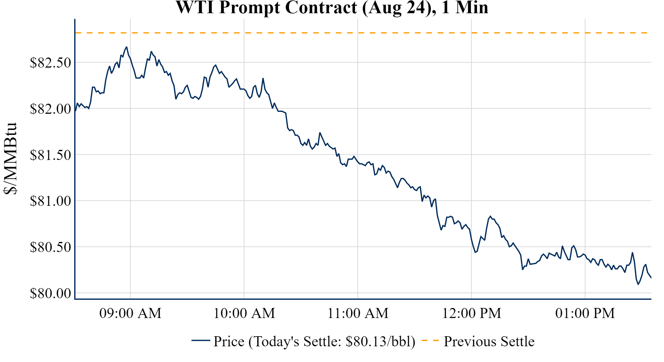 Prompt-Month WTI (Aug 24) was down $-2.69 on the day, to settle at $80.13