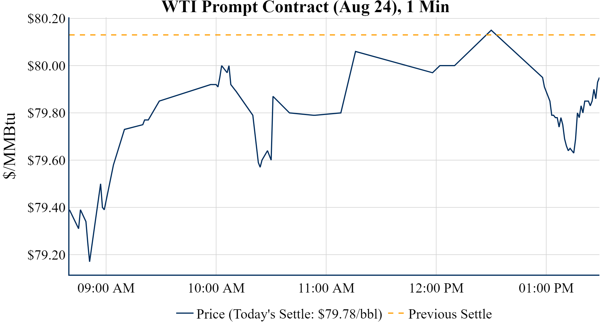 Prompt-Month WTI (Aug 24) was down $-0.35 on the day, to settle at $79.78