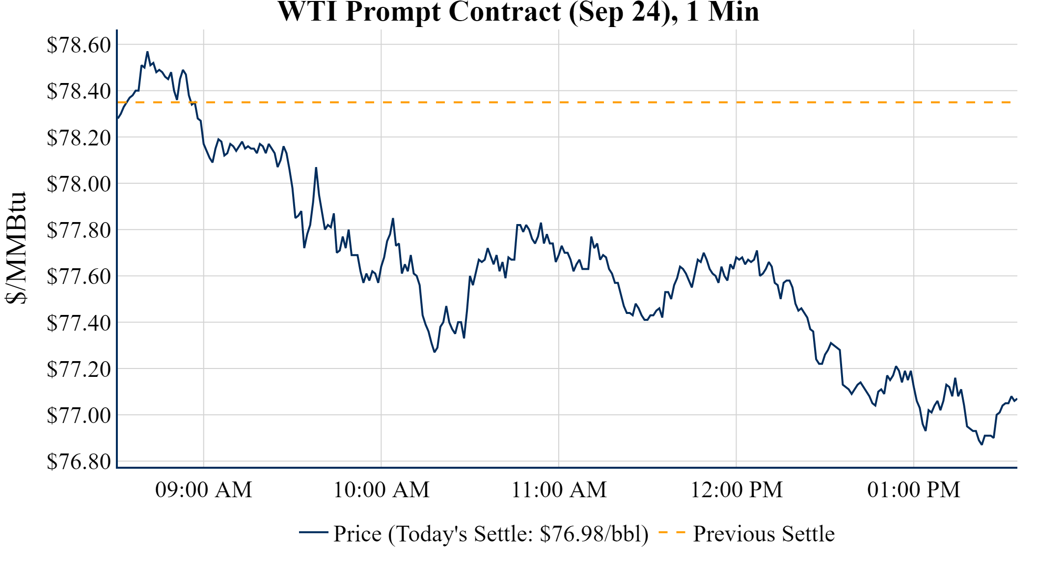 Prompt-Month WTI (Sep 24) was down $-1.37 on the day, to settle at $76.98