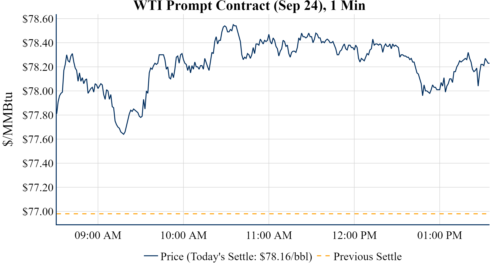 Prompt-Month WTI (Sep 24) was up $1.18 on the day, to settle at $78.16