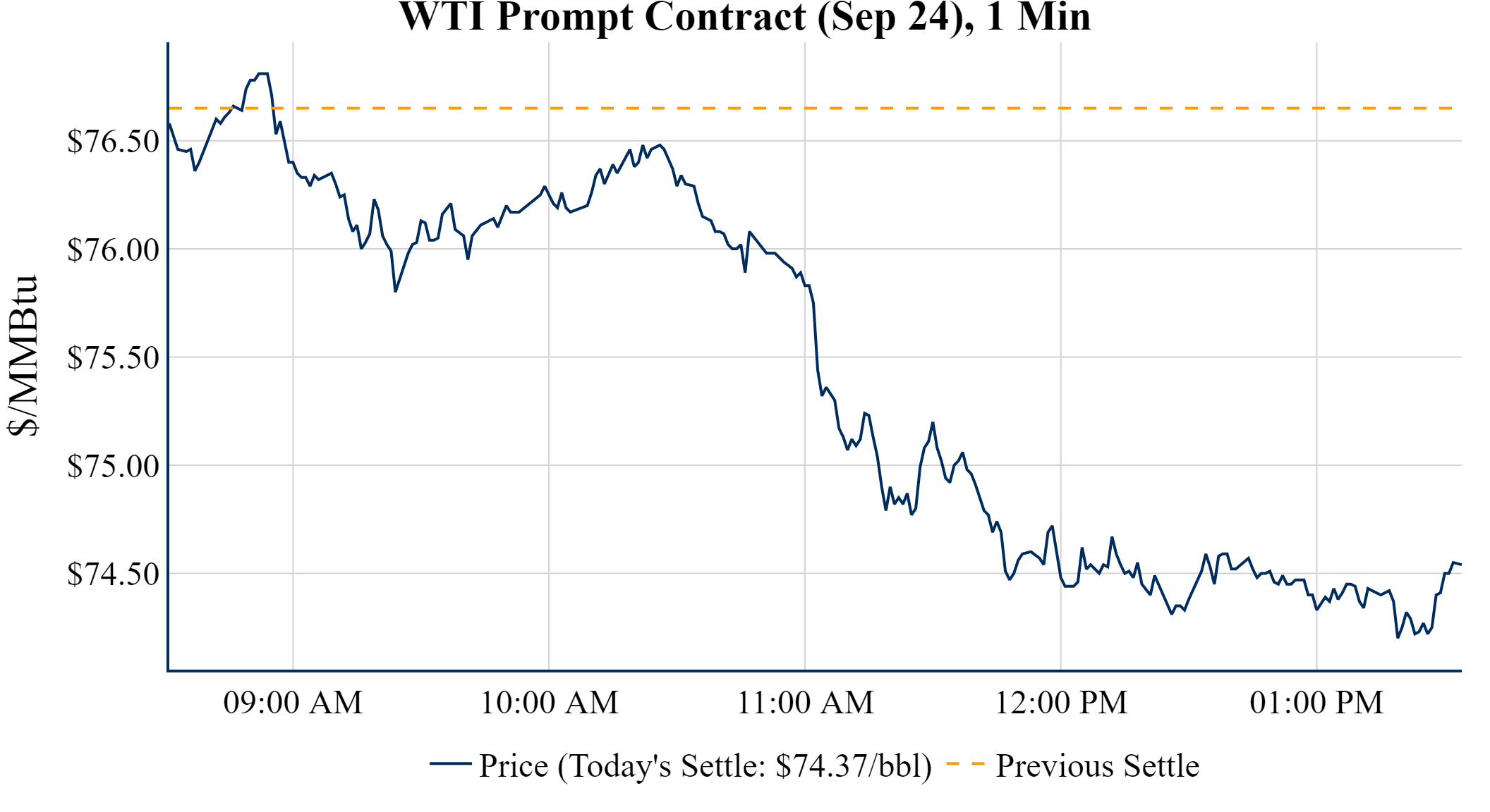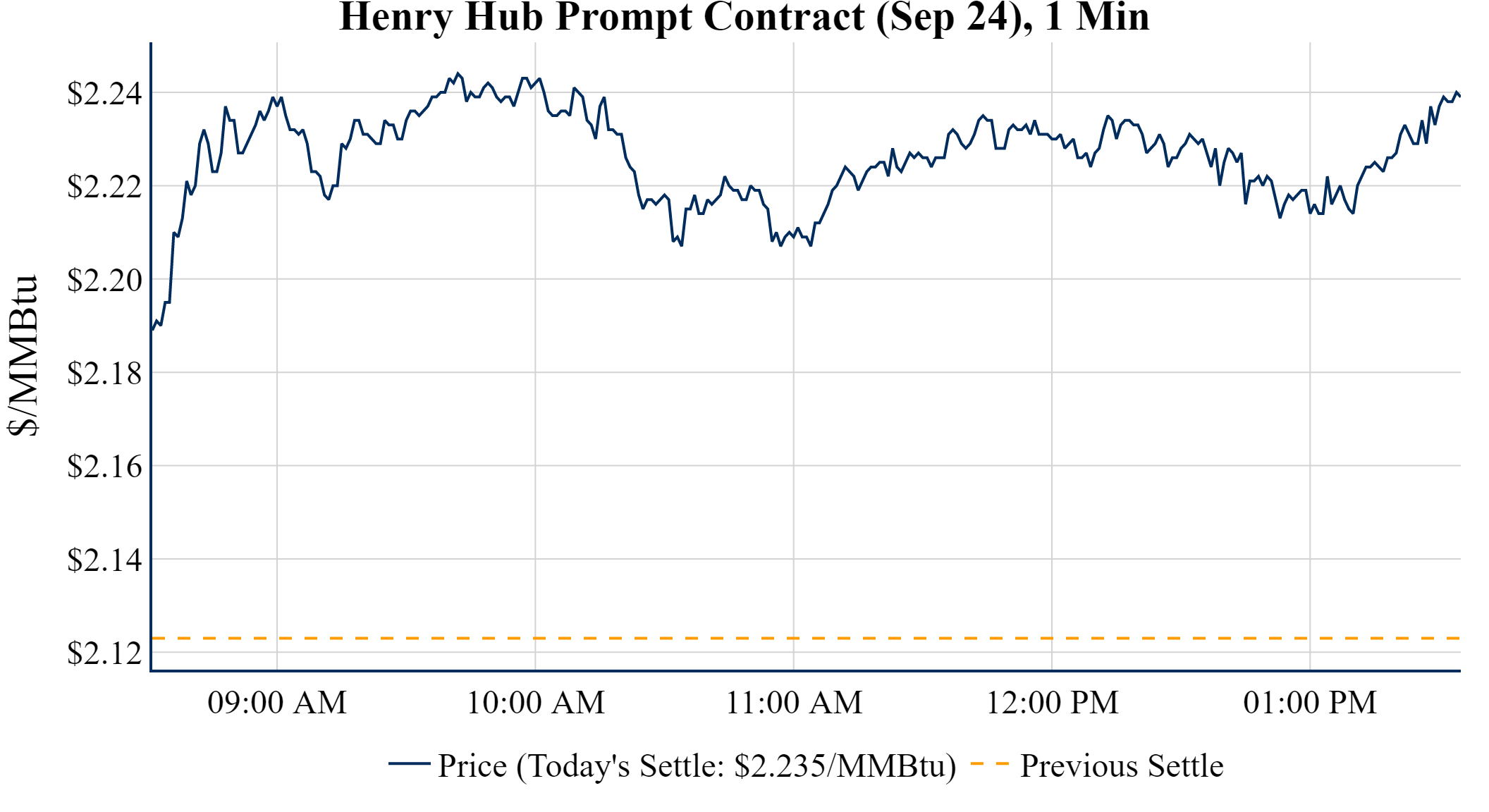 Prompt-Month Henry Hub (Sep 24) was up $0.112 on the day, to settle at $2.235 Prompt-Month WTI (Sep 24) was down $-2.28 on the day, to settle at $74.37