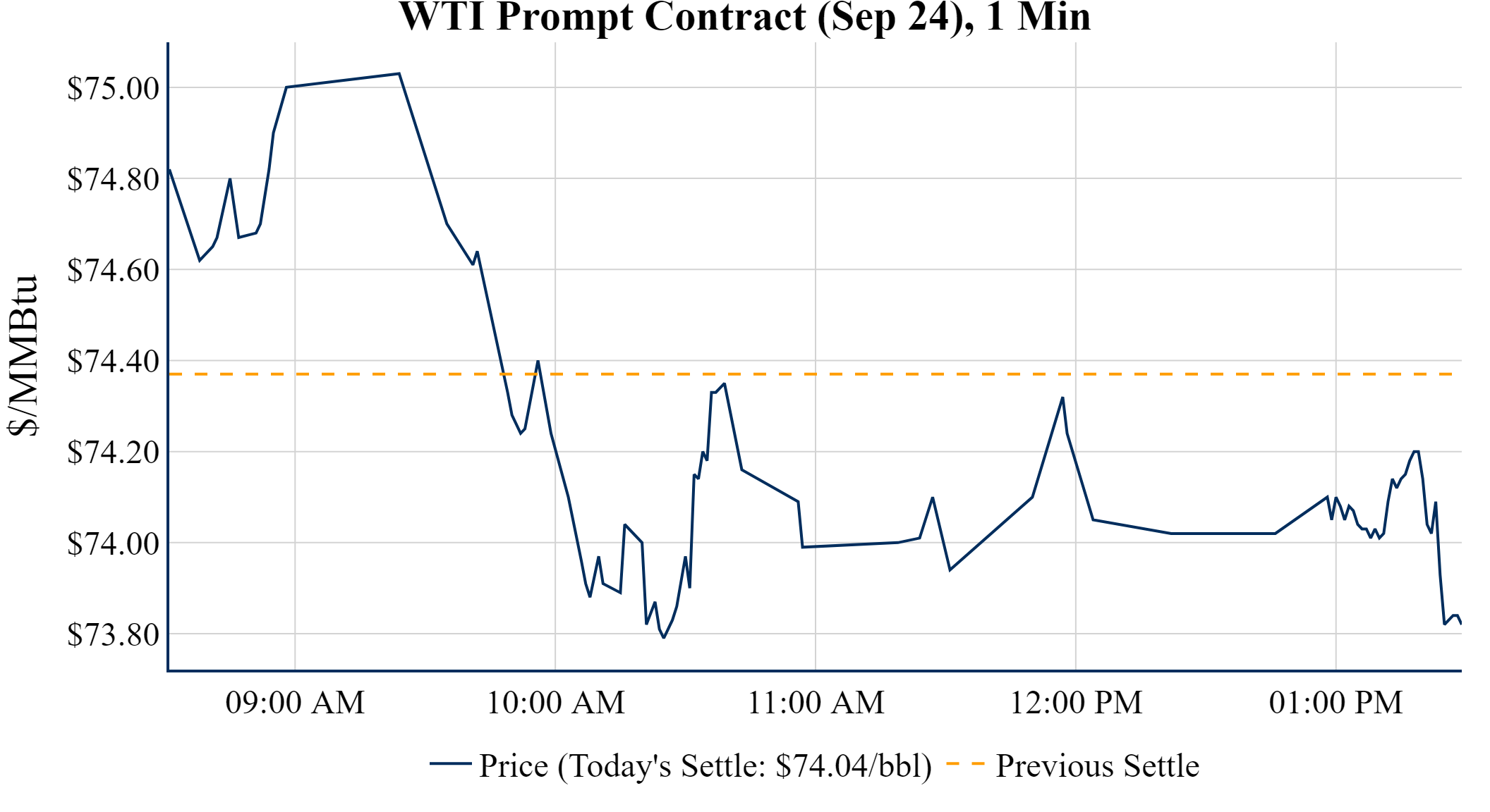 Prompt-Month WTI (Sep 24) was down $-0.33 on the day, to settle at $74.04