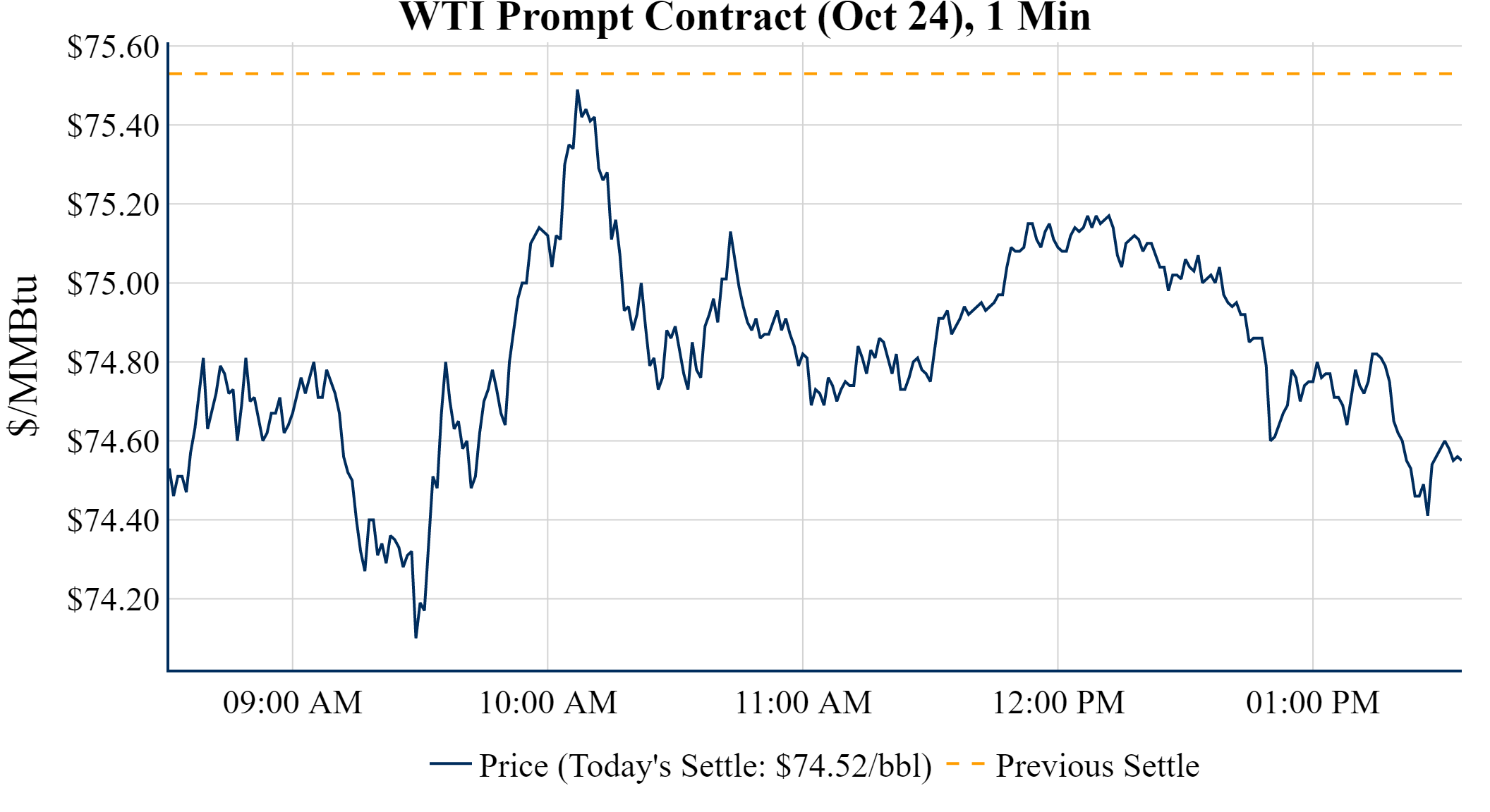 Prompt-Month WTI (Oct 24) was down $-1.01 on the day, to settle at $74.52