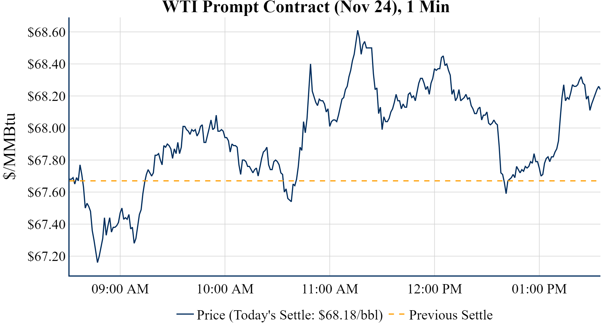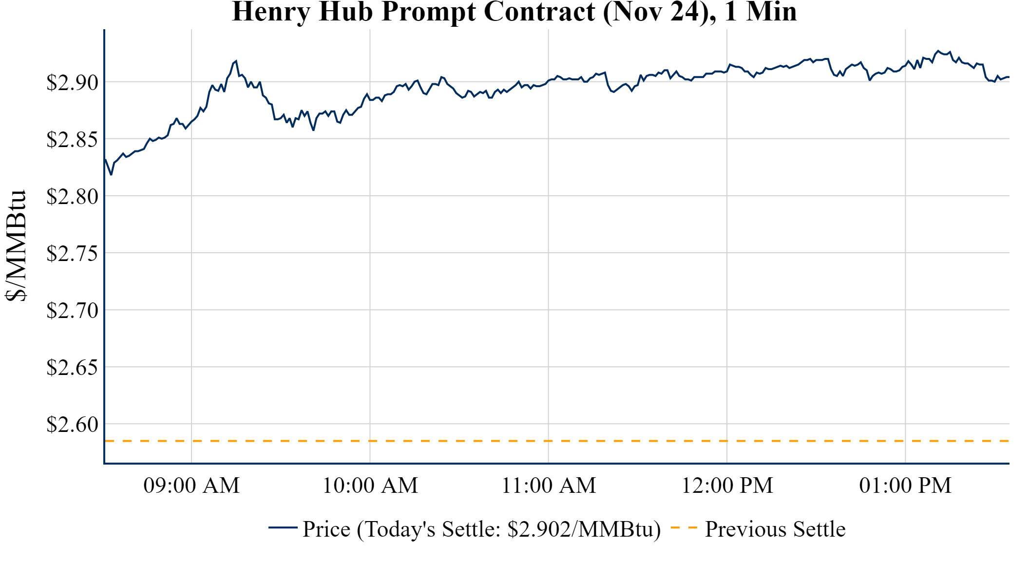 Prompt-Month Henry Hub (Nov 24) was up $0.149 on the day, to settle at $2.902Prompt-Month WTI (Nov 24) was up $0.51 on the day, to settle at $68.18