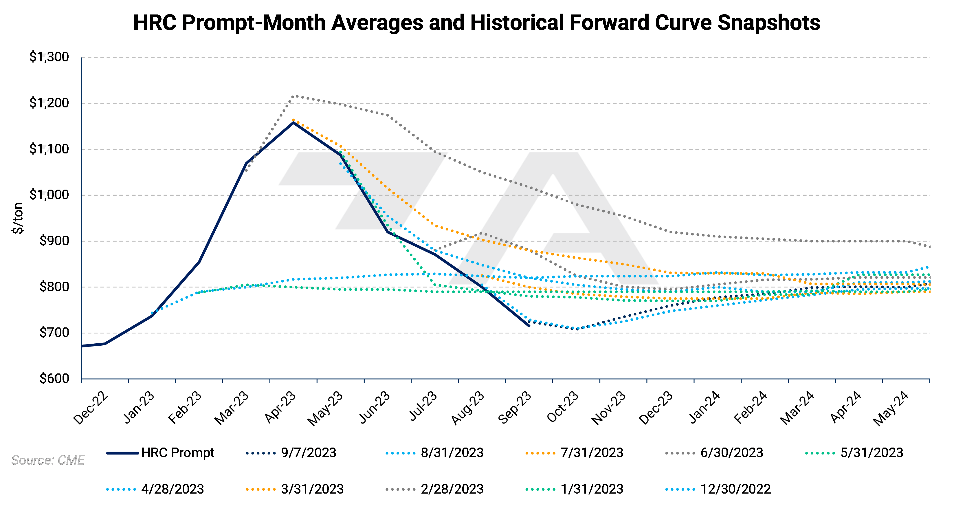 Why are prices and profitability dropping?Ample HRC supplies amid subpar end-user demand have pressured prices for HRC and busheling scrap since early spring 2023. This, in turn, has pressured steel profitability, as illustrated below. Based on the current futures forward curve, the spread shows slight improvement over the next several months, reaching nearly $390/st by summer 2024. The looming auto workers strike could further deteriorate steel demand, prices, and profitability. |