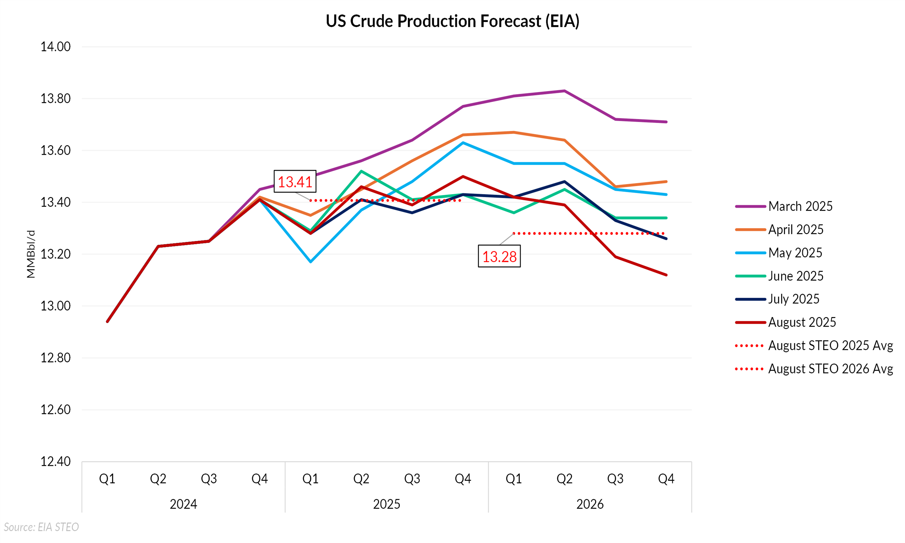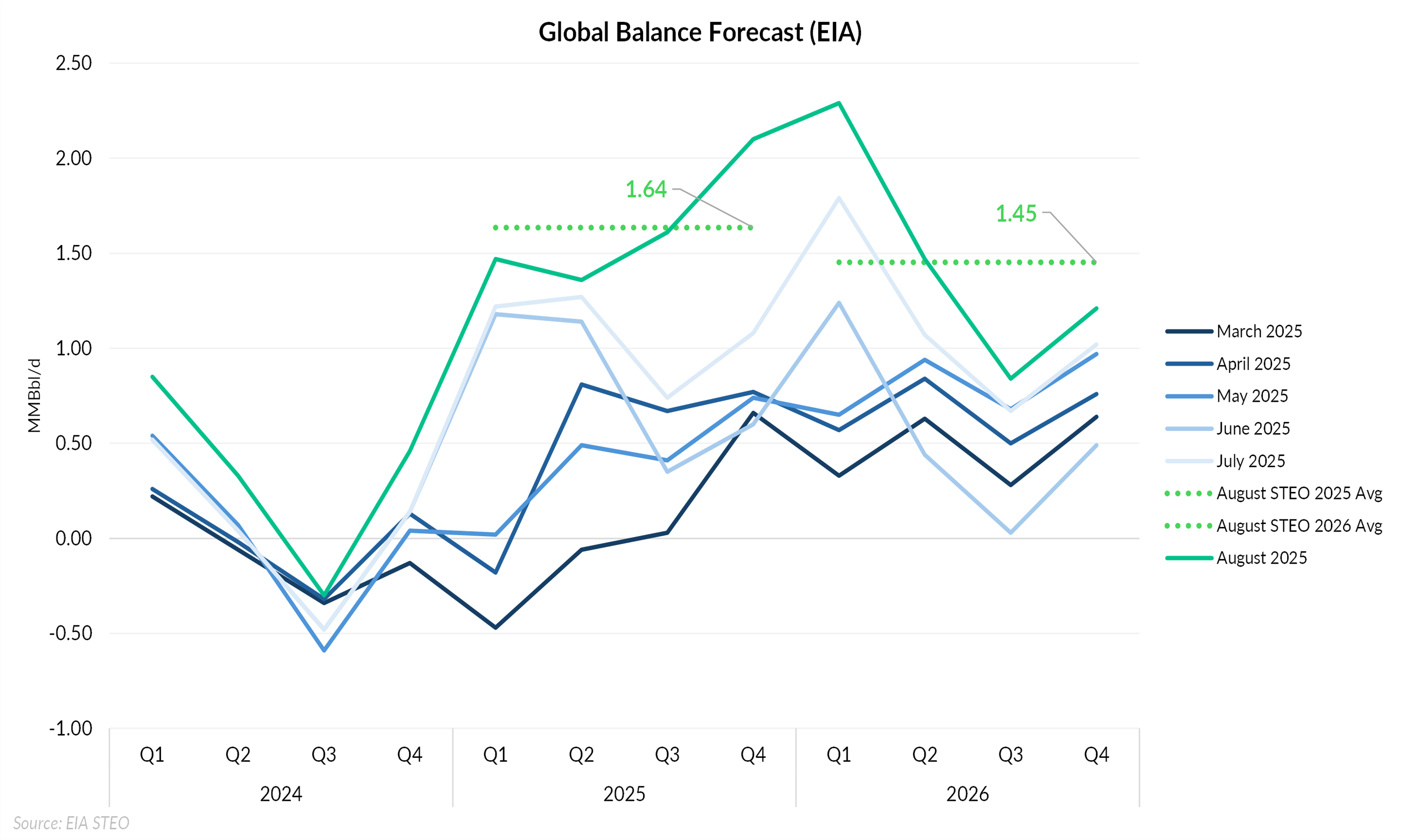 OECD commercial stocks are now projected to grow by more than 2 MMBbl/d in 4Q25 and 1Q26, about 0.8 MMBbl/d higher than last month’s STEO. The EIA anticipates that weaker prices in early 2026 will lead both OPEC+ and some non-OPEC producers to trim output, potentially slowing stock builds in the latter part of 2026.