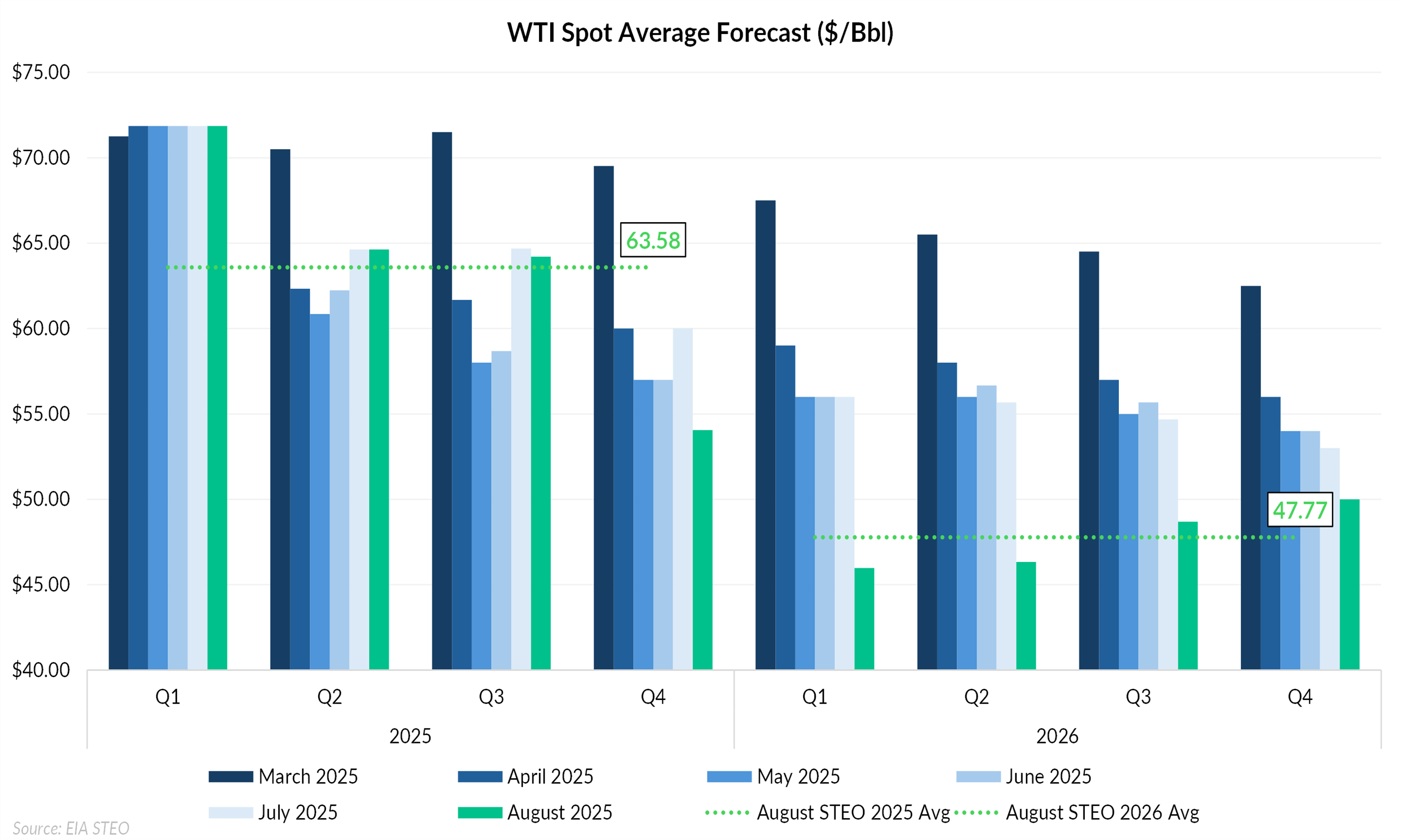 In its latest Short-Term Energy Outlook (STEO), the EIA lowered its near-term oil price forecasts. The chart below underscores the shift in sentiment, with the green bars showing the EIA’s current quarterly outlook (yearly averages marked by the dotted lines) and the adjacent blue bars representing projections from previous monthly STEO reports. West Texas Intermediate (WTI) is now expected to average $63.58/Bbl in 2025, down $1.64 from last month’s projection, and $47.77/Bbl in 2026, a steep $7.05 decrease from the prior forecast. The downward revisions reflect expectations for sizable inventory builds following OPEC+’s decision to accelerate the unwinding of its 2.2 MMBbl/d production cuts.
