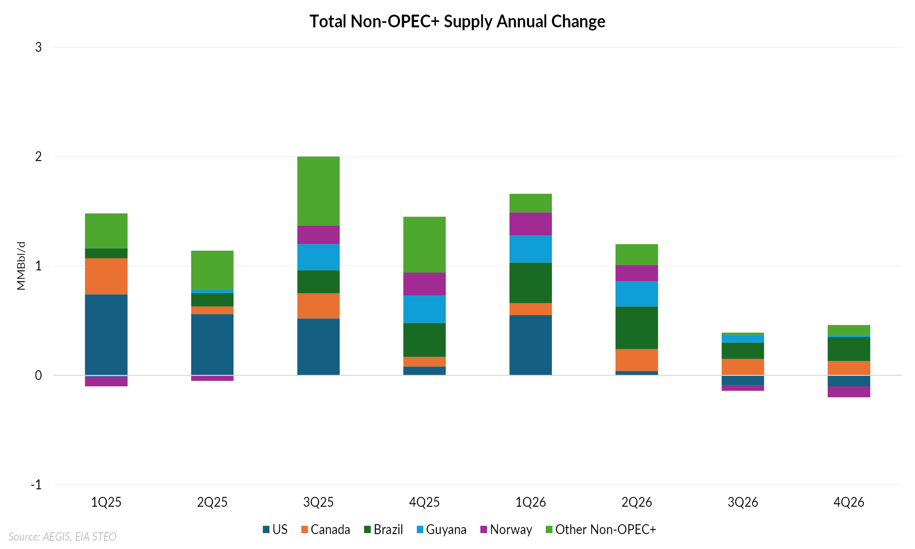 A major driver of the projected builds is the full unwinding of OPEC+’s 2.2 MMBbl/d production cuts, which were originally scheduled to remain in place until September 2026 but were phased out a full year early. The group’s restored production is expected to contribute materially to global inventory builds through 2026, adding significant downside risk for crude prices.