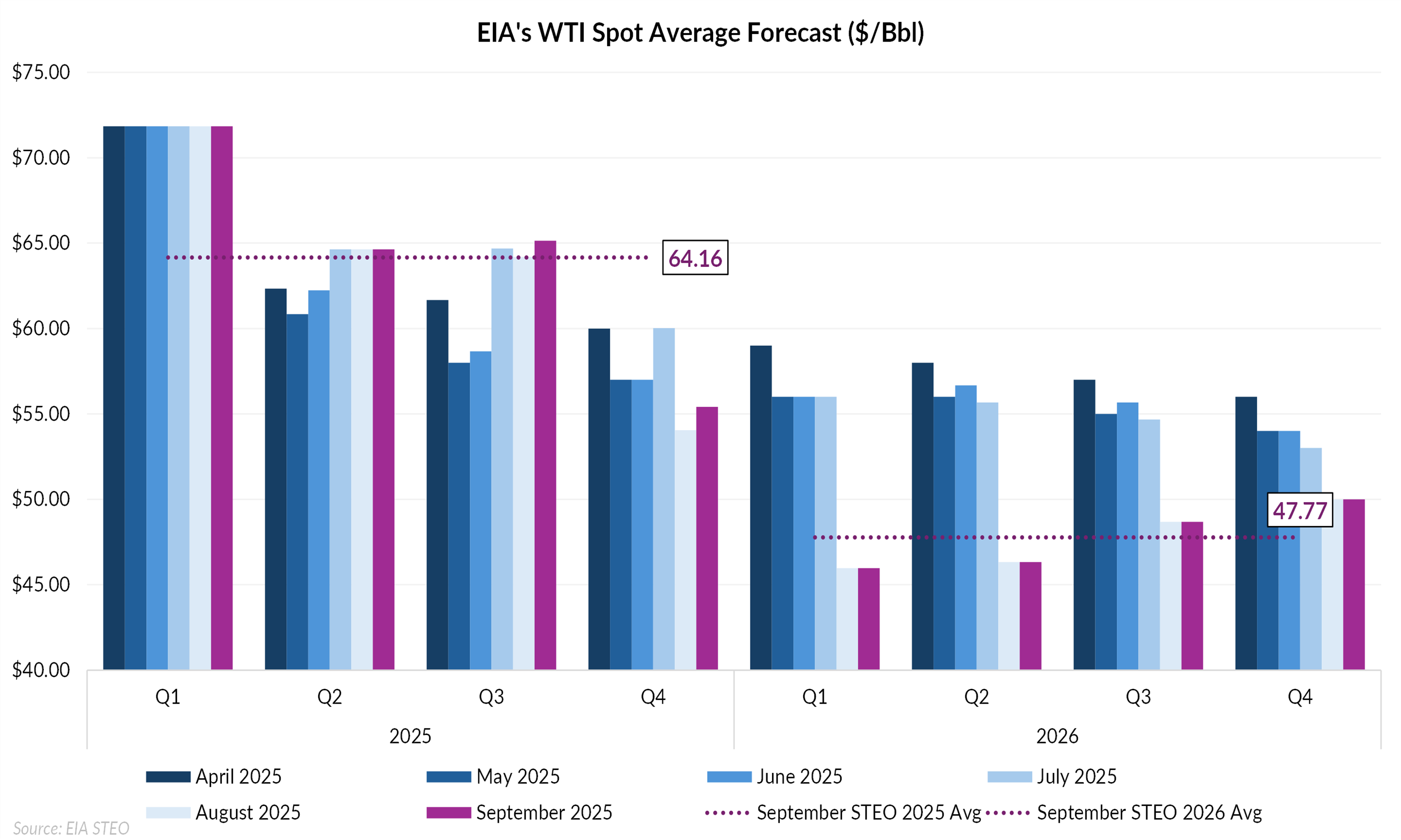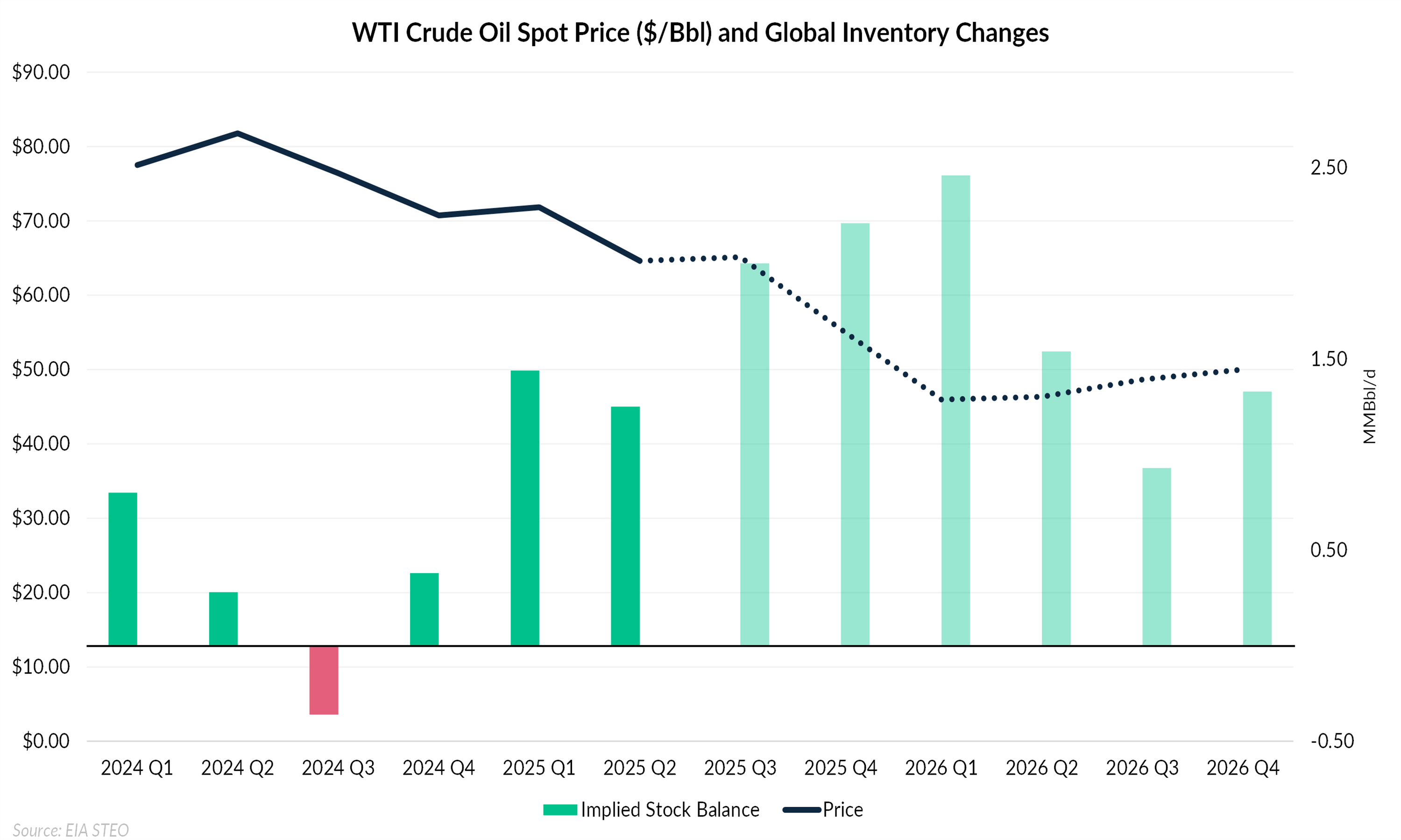 In its latest Short-Term Energy Outlook (STEO), the EIA projects that significant growth in global oil inventories will place sustained downward pressure on crude prices heading into 4Q 2025. This forecast reflects the seasonal slowdown in summer demand as well as a surge in global oil supply growth. Despite this broadly bearish outlook, the EIA raised its 2025 annual average WTI spot price projection by $0.58, from last month’s STEO, to $64.16/bbl. Even with this upward revision, the report maintains its longer-term view of a much lower annual average WTI price of $47.77