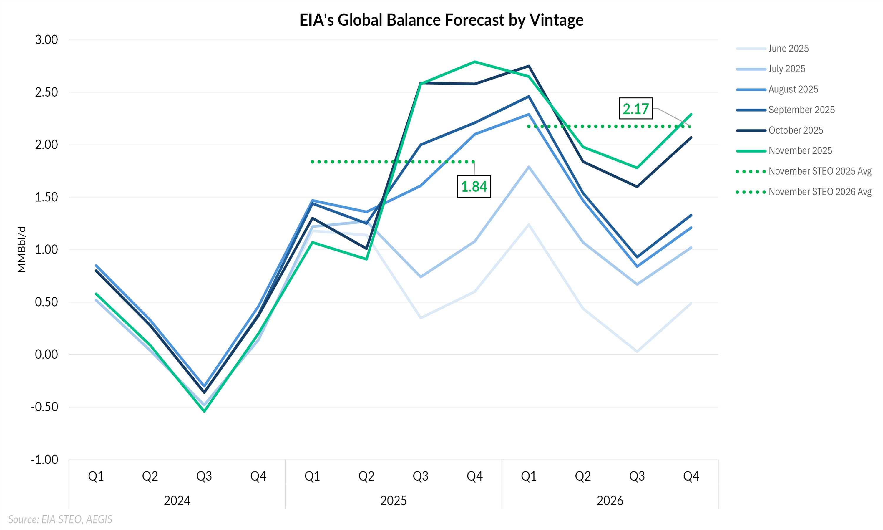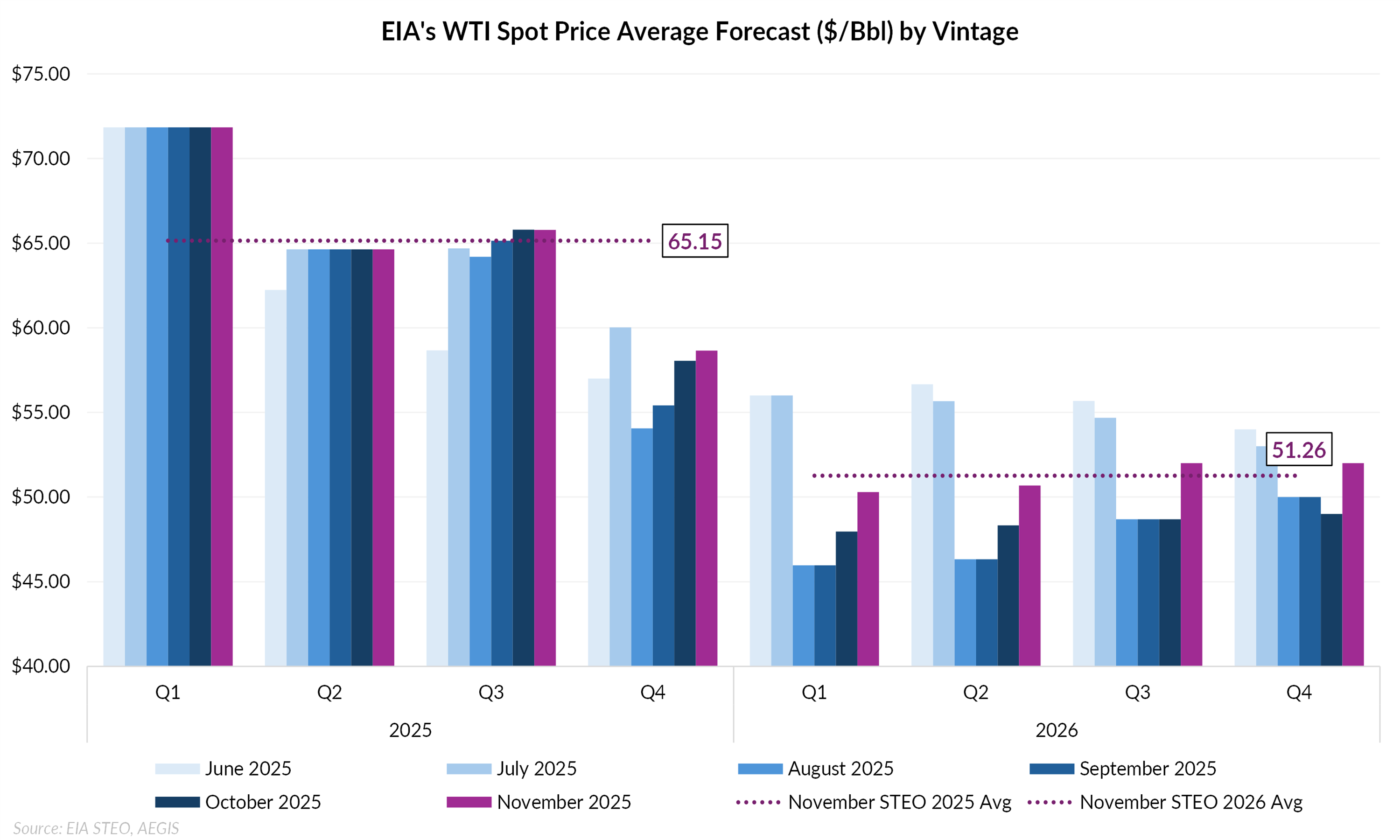The November 2025 STEO underscores the complexity of the current oil market environment. Even as the EIA projects a more pronounced supply surplus and faster inventory builds, it has revised its price forecasts higher, reflecting the outsized influence of strategic stockpiling in China and geopolitical risks surrounding Russian supply. While fundamentals point to lower prices, market risks and uncertainties are keeping a floor under the outlook.