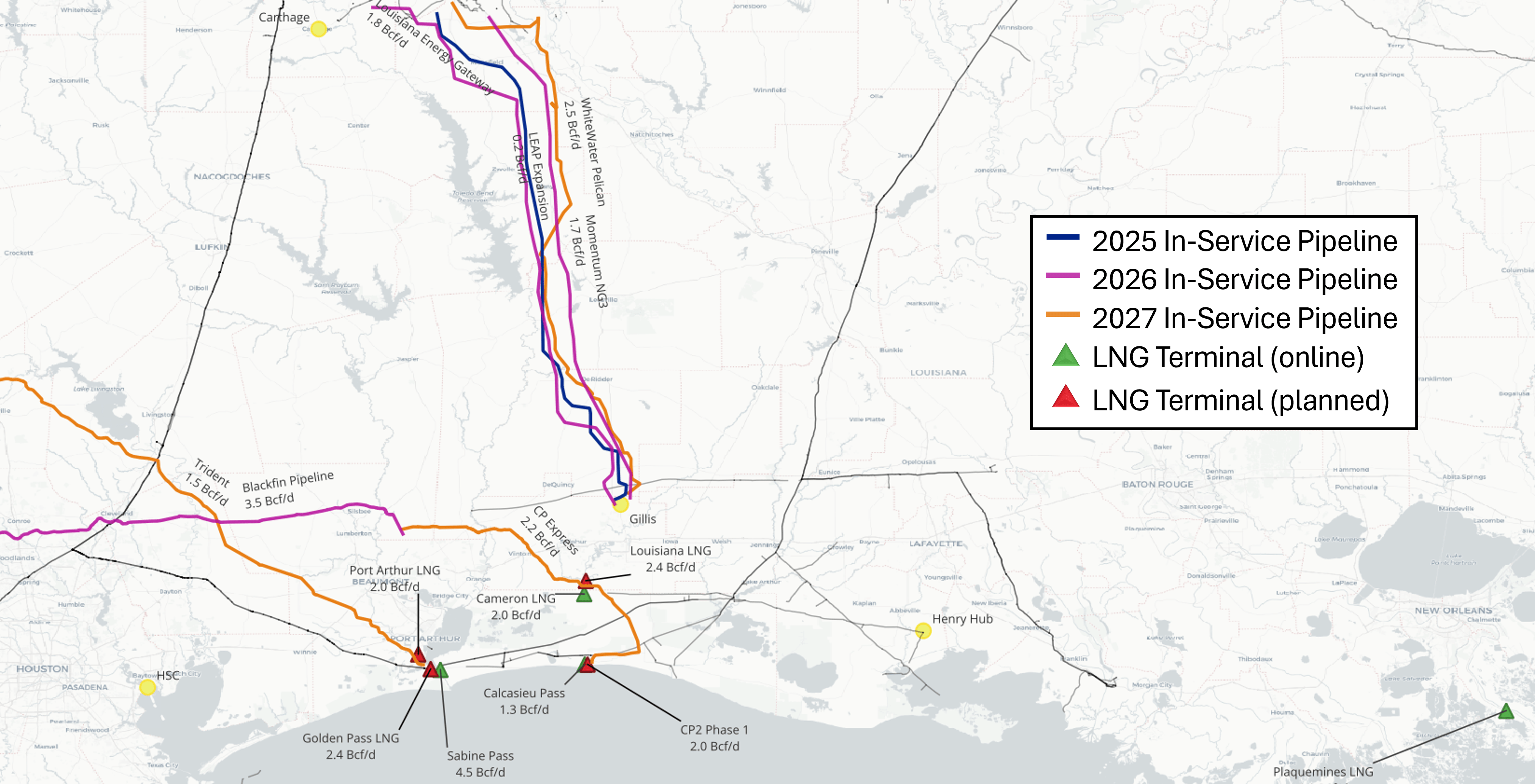 Trident Pipeline - Kinder Morgan’s Trident Pipeline is a 216-mile, 2.0 Bcf/d intrastate system moving Permian gas from Katy, Texas, to the Port Arthur LNG corridor near the Louisiana border. By targeting demand from Gulf Coast export terminals like Golden Pass LNG, Trident introduces direct competition to Haynesville producers supplying the same markets. Trident is expected to enter service in early 2027, with capacity expandable to 2.8 Bcf/d.