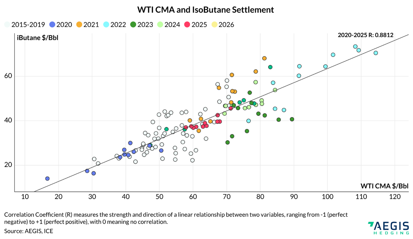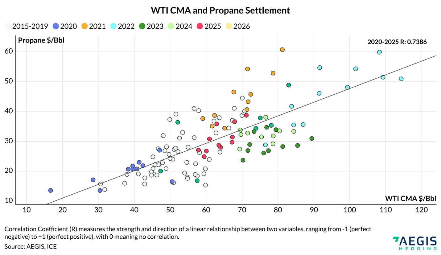 The chart below shows the forward curves for WTI, propane, butane, isobutane and natural gasoline as of the settle on January 1, 2026. It’s clear that propane and the butanes follow a seasonal pattern, similar to natural gas, where demand and therefore price rise during winter and relax during summer. This is not a pattern observed in the WTI forward curve. The seasonal influences on propane and butane reduce the price correlation to WTI. This means seasonal patterns create basis risk between NGLs and WTI.